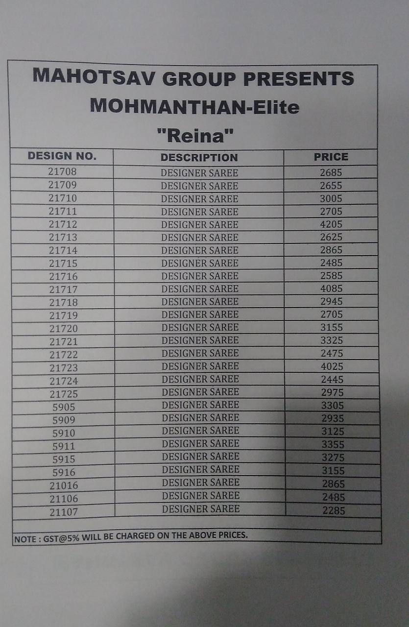 Buy Online Reina Series 21700 By Mahotsav Single And Set Stockiest And Supplier From Surat 18 Pcs of Full Catalogue at Wholesale Price. Looking for Reina Series 21700 By Mahotsav Single And Set Stockiest And Supplier From Surat Full Catalouge at Best Price? Buy Now Reina Series 21700 By Mahotsav Single And Set Stockiest And Supplier From Surat at Wholesale Rate of Rs 0 with Total 18 Pcs from authroized dealer and supplier of Mahotsav Saree Brand. Cost of Each piece is just only Rs 0 which is very low and affordable price to resale the product in your retail store ,This is Surat based Wholesale Supplier & Dealer of Mahotsav Saree Brand. Click on Brand name to Know more about Mahotsav Saree Brand's products.Call or Whatsapp on 9898838984 for booking or enquiry