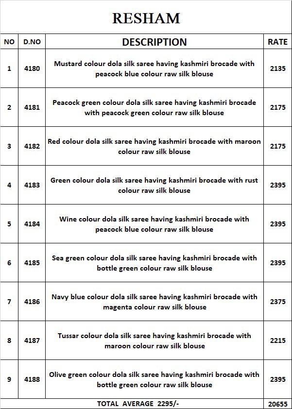 *LOOSE PCS AVAILABLE* *NAKKASHI* Type - saree. CATALOG NAME - *RESHAM* . SERIES - *4180 TO 4188*. *FABRICS DETAILS* *&* *RATE LIST ATTACHED* GST 5% EXTRA *Set & loose & Single* . *READY TO SHIP* BOOK YOUR ORDER NOW 100+single |