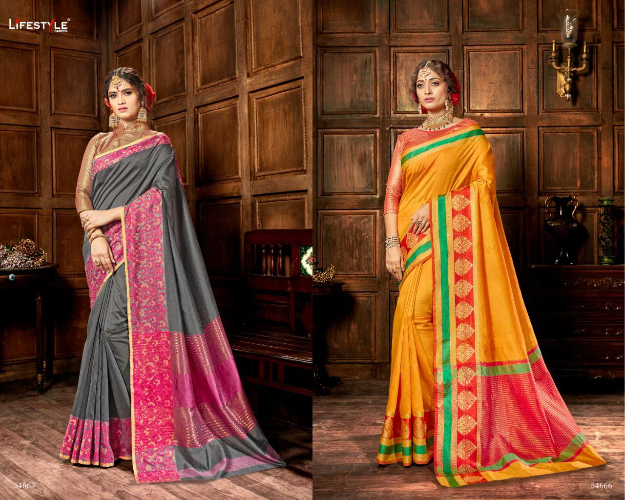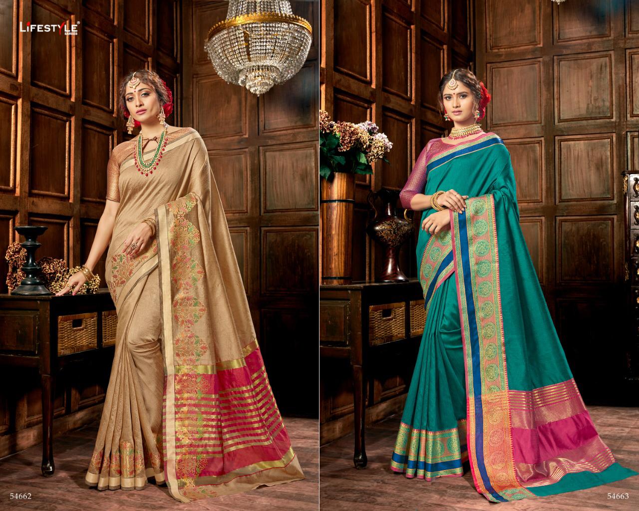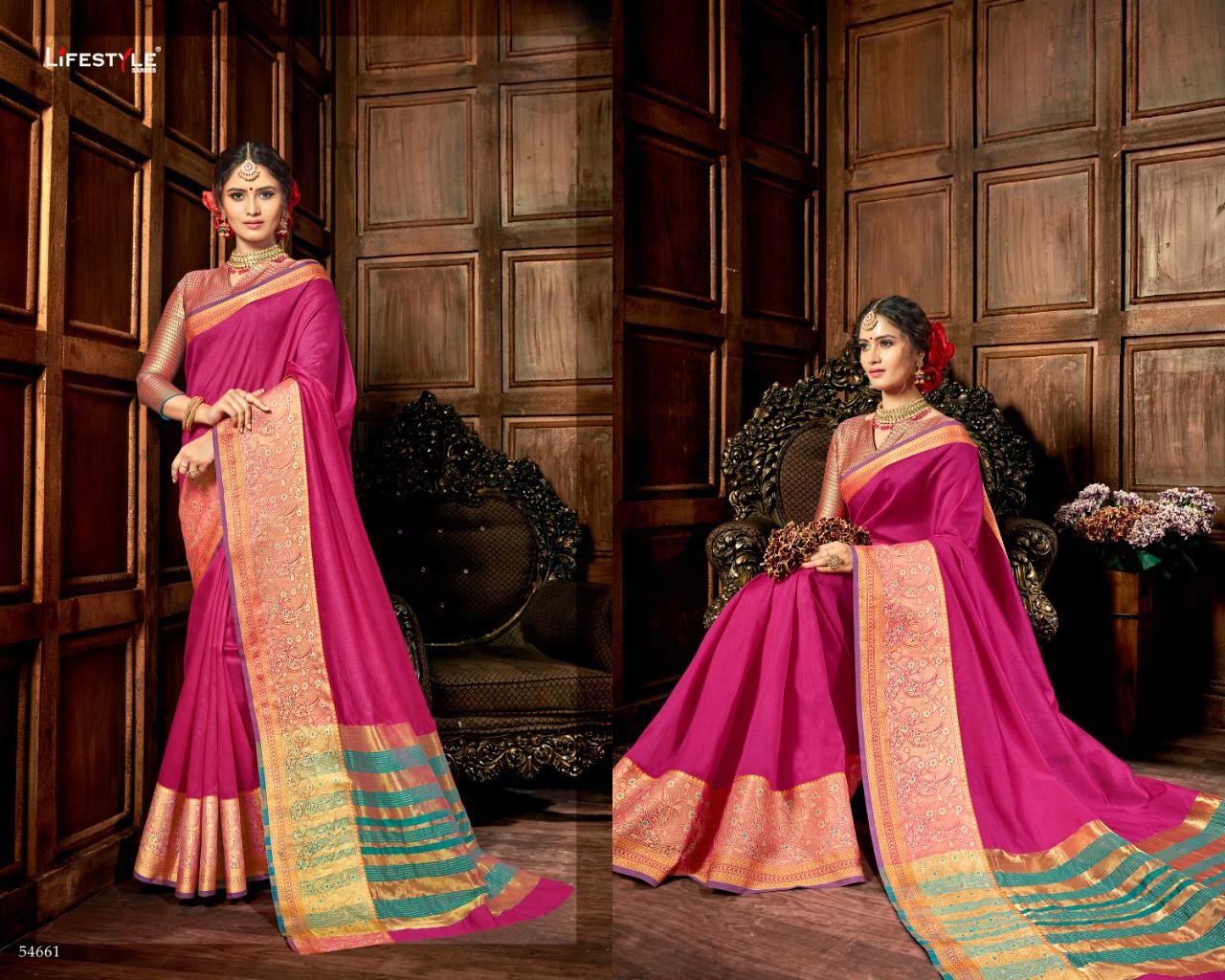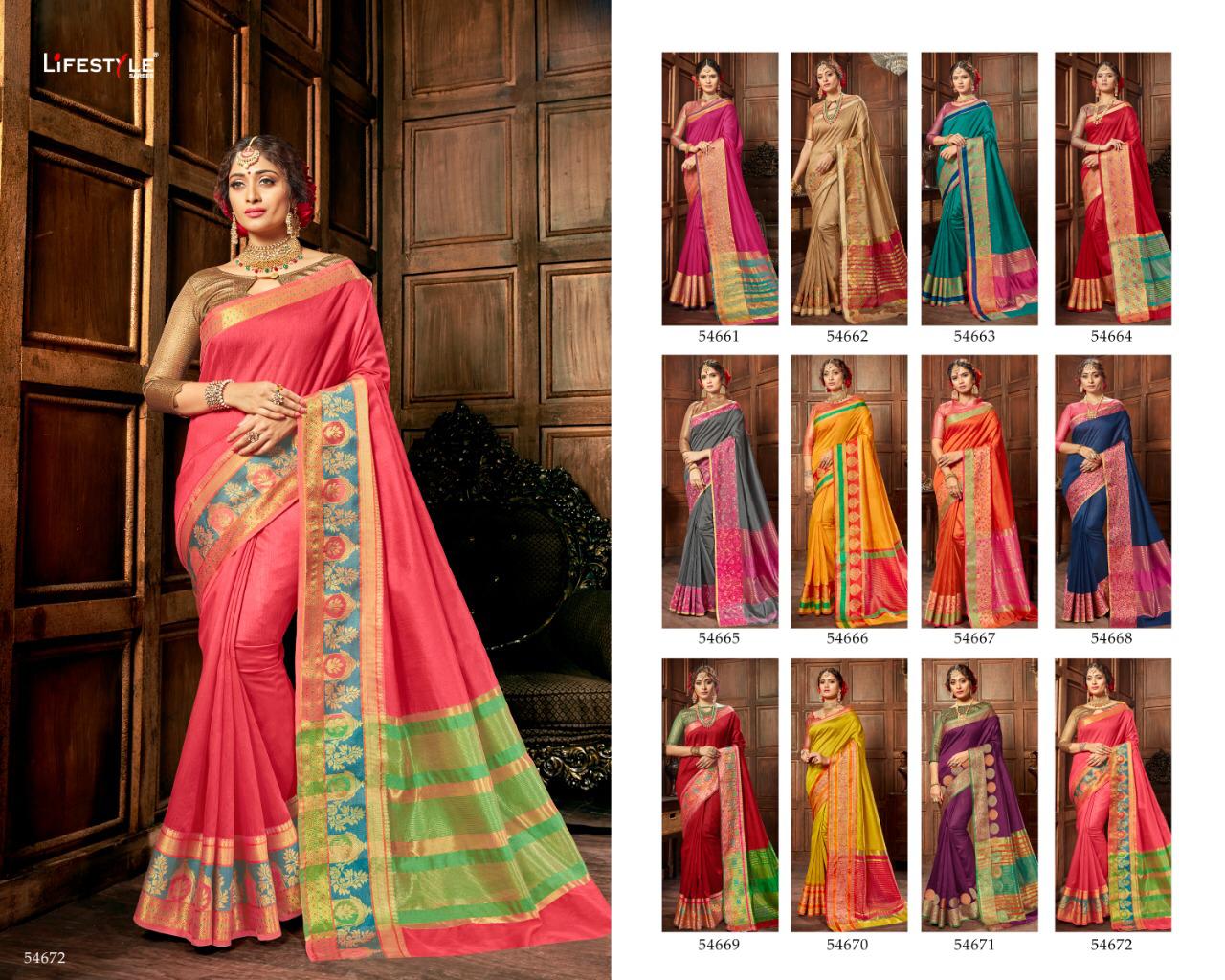 Buy Online Resham Silk By Lifestyle 54661 Series Fancy Silk Saree Collection Wholesaler Surat 12 Pcs of Full Catalogue at Wholesale Price. Looking for Resham Silk By Lifestyle 54661 Series Fancy Silk Saree Collection Wholesaler Surat Full Catalouge at Best Price? Buy Now Resham Silk By Lifestyle 54661 Series Fancy Silk Saree Collection Wholesaler Surat at Wholesale Rate of Rs 8700 with Total 12 Pcs from authroized dealer and supplier of LIFESTYLE Brand. Cost of Each piece is just only Rs 725 which is very low and affordable price to resale the product in your retail store ,This is Surat based Wholesale Supplier & Dealer of LIFESTYLE Brand. Click on Brand name to Know more about LIFESTYLE Brand's products.Call or Whatsapp on 9898838984 for booking or enquiry