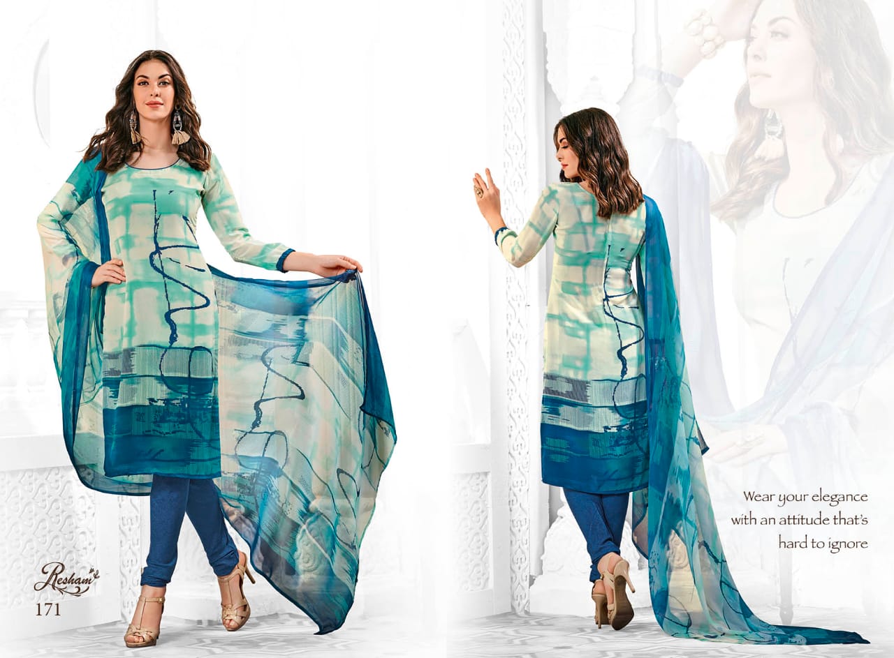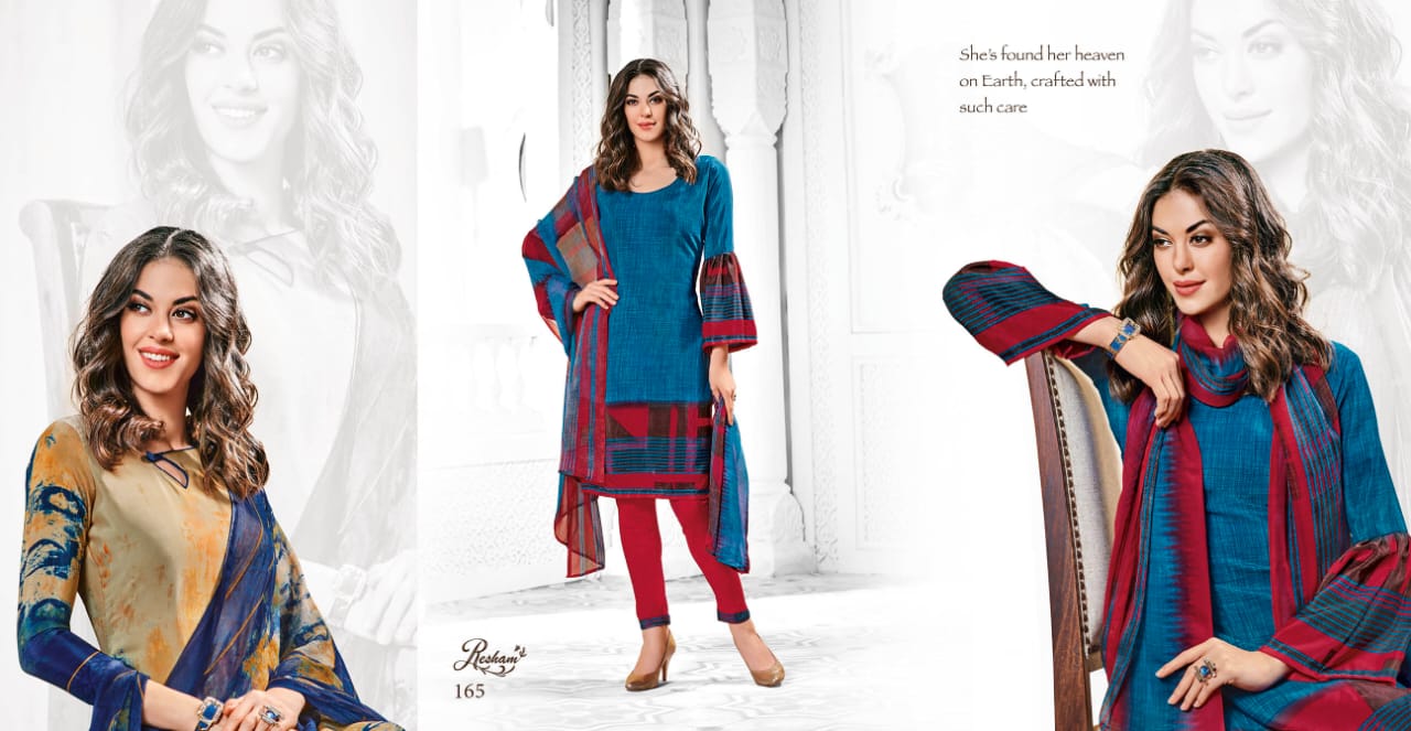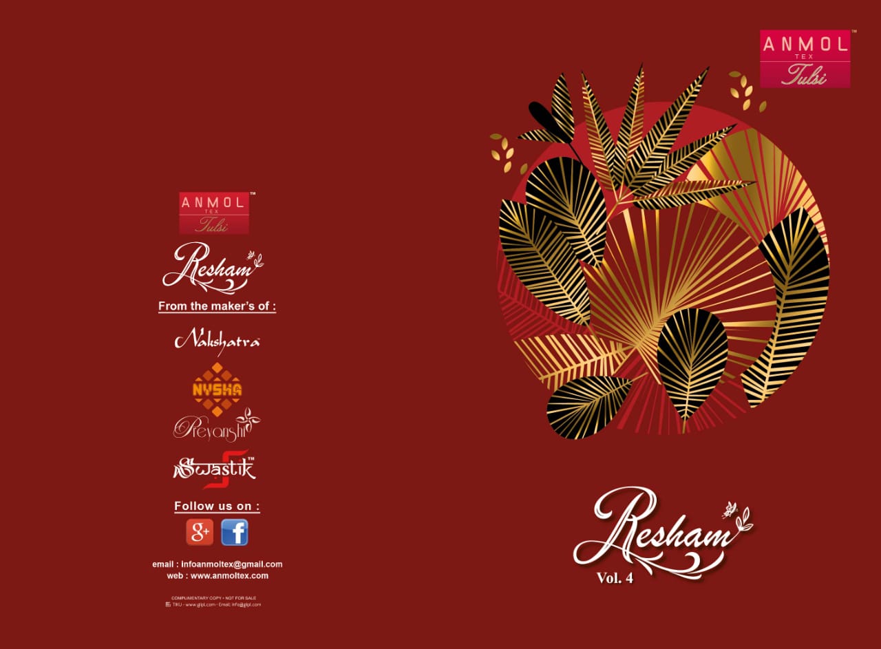 *A N M O L T E X* _P R E S E N T S_ ?? *R E S H A M*?? *Vol.4* *ENCHANT YOUR FASHION.* ? *Top* : French Crape 12kg. ? *Bottom* : American Crape ??? *Dupatta*: Wrinkle Chiffon *Rate* 281/- ( *Bag Packing* ) 291/- ( *Hanger Packing*) |