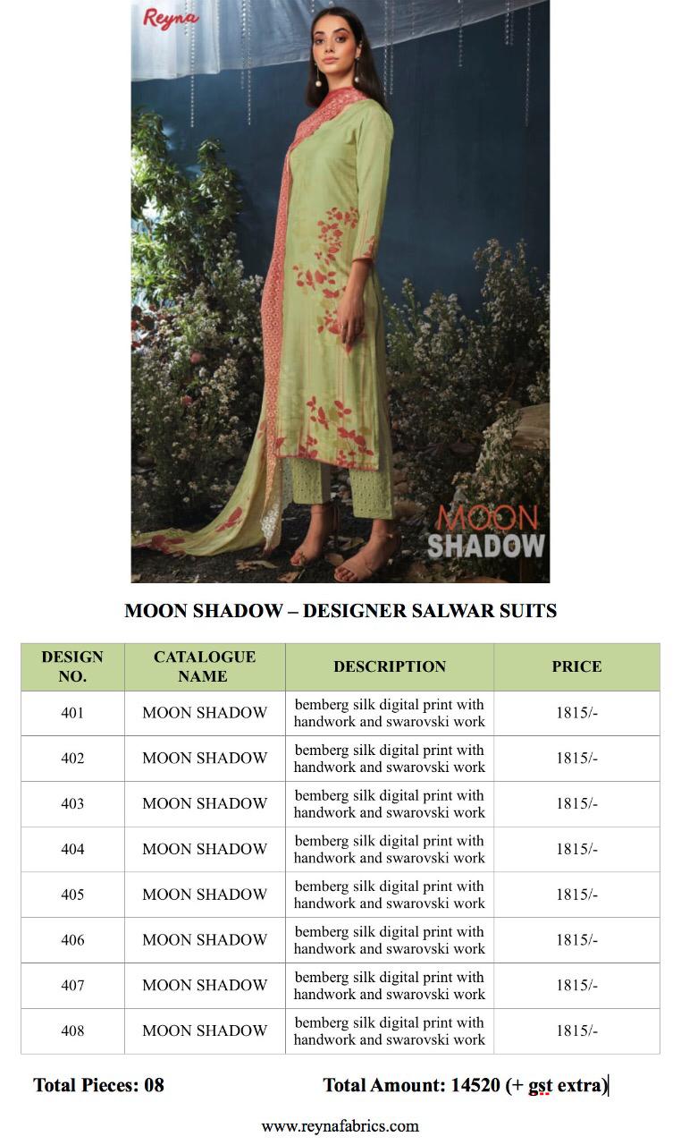 Buy Online Reyna Moon Shadow Silk Designer Party Wear Suits Wholesale Supplier Nd Dealer Gujarat 8 Pcs of Full Catalogue at Wholesale Price. Looking for Reyna Moon Shadow Silk Designer Party Wear Suits Wholesale Supplier Nd Dealer Gujarat Full Catalouge at Best Price? Buy Now Reyna Moon Shadow Silk Designer Party Wear Suits Wholesale Supplier Nd Dealer Gujarat at Wholesale Rate of Rs 14520 with Total 8 Pcs from authroized dealer and supplier of Brand. Cost of Each piece is just only Rs 1815 which is very low and affordable price to resale the product in your retail store ,This is Surat based Wholesale Supplier & Dealer of Brand. Click on Brand name to Know more about Brand's products.Call or Whatsapp on 9898838984 for booking or enquiry
