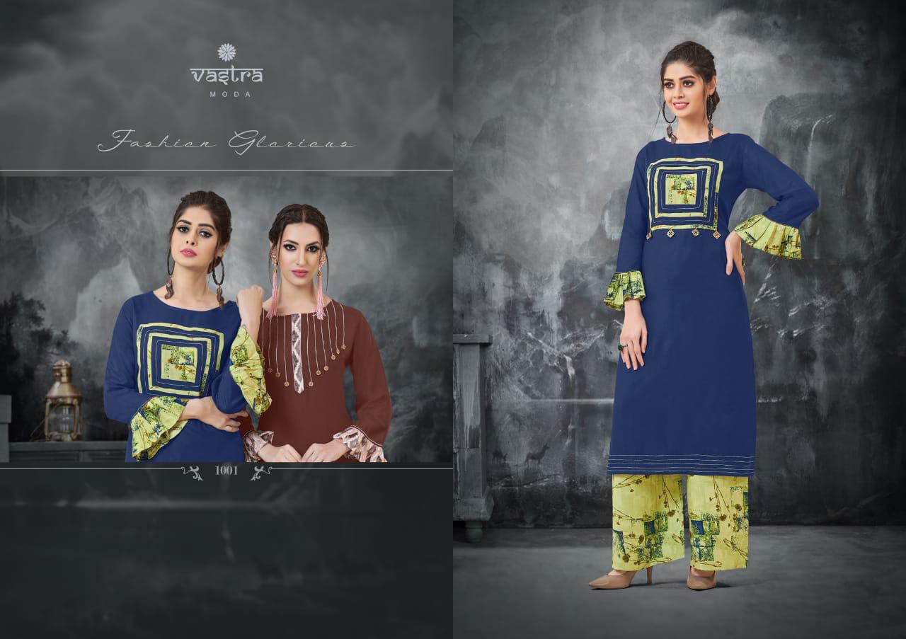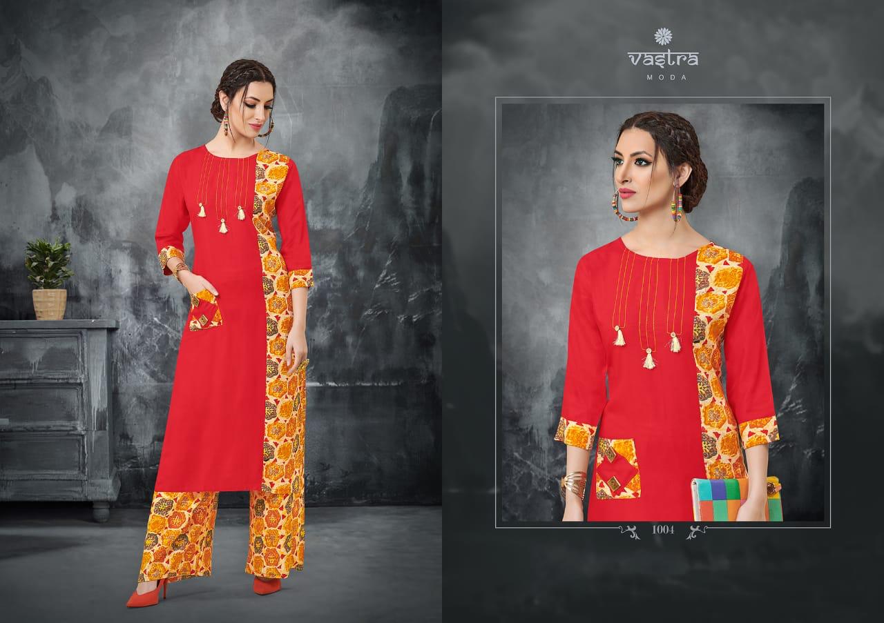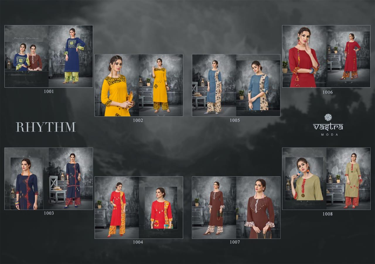 Buy Online Rhythm Vol 1 By Vastra Moda Reyon Cotton Kurtis With Plazzo Set Wholesale Supplier Surat 8 Pcs of Full Catalogue at Wholesale Price. Looking for Rhythm Vol 1 By Vastra Moda Reyon Cotton Kurtis With Plazzo Set Wholesale Supplier Surat Full Catalouge at Best Price? Buy Now Rhythm Vol 1 By Vastra Moda Reyon Cotton Kurtis With Plazzo Set Wholesale Supplier Surat at Wholesale Rate of Rs 5560 with Total 8 Pcs from authroized dealer and supplier of Brand. Cost of Each piece is just only Rs 695 which is very low and affordable price to resale the product in your retail store ,This is Surat based Wholesale Supplier & Dealer of Brand. Click on Brand name to Know more about Brand's products.Call or Whatsapp on 9898838984 for booking or enquiry