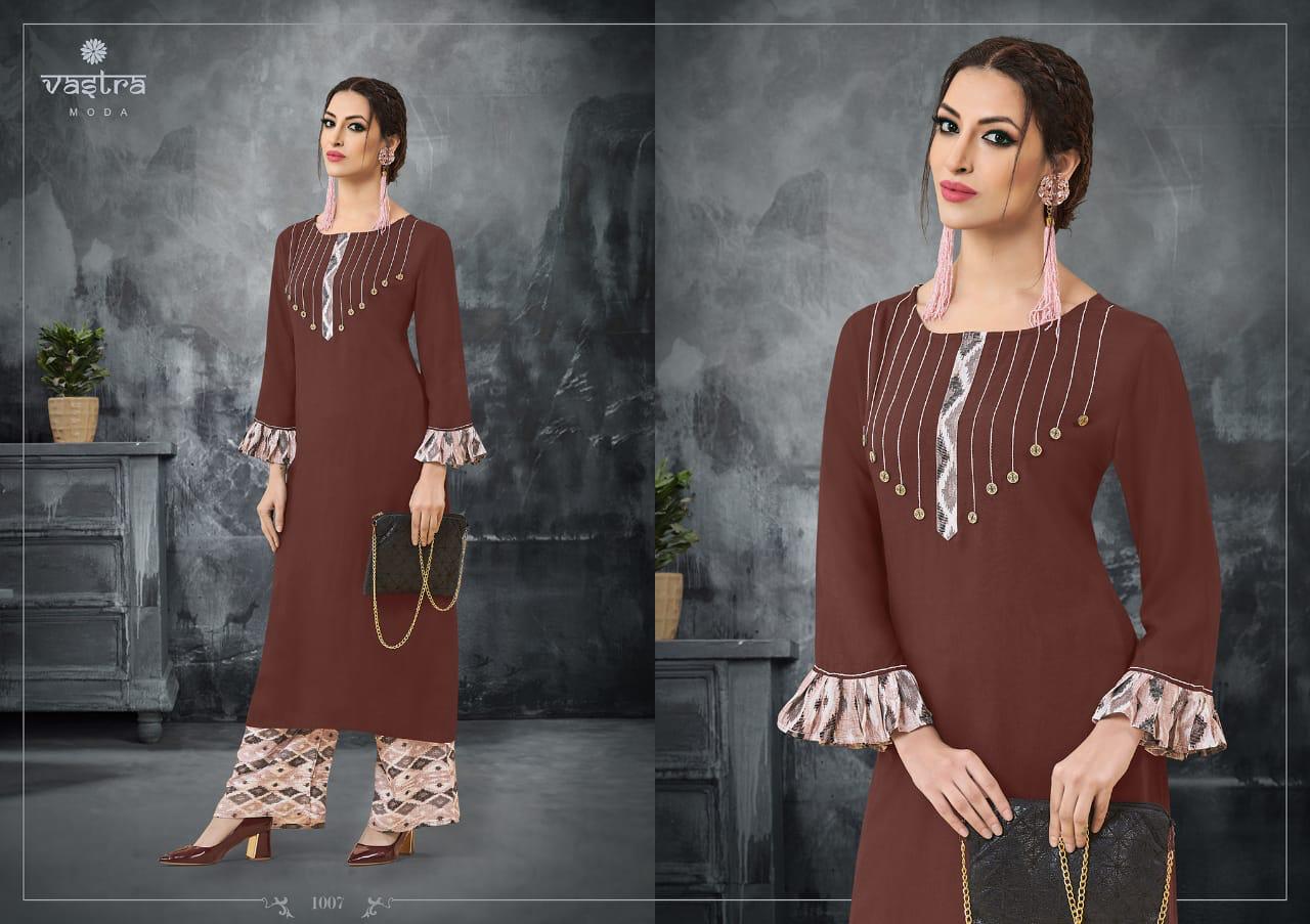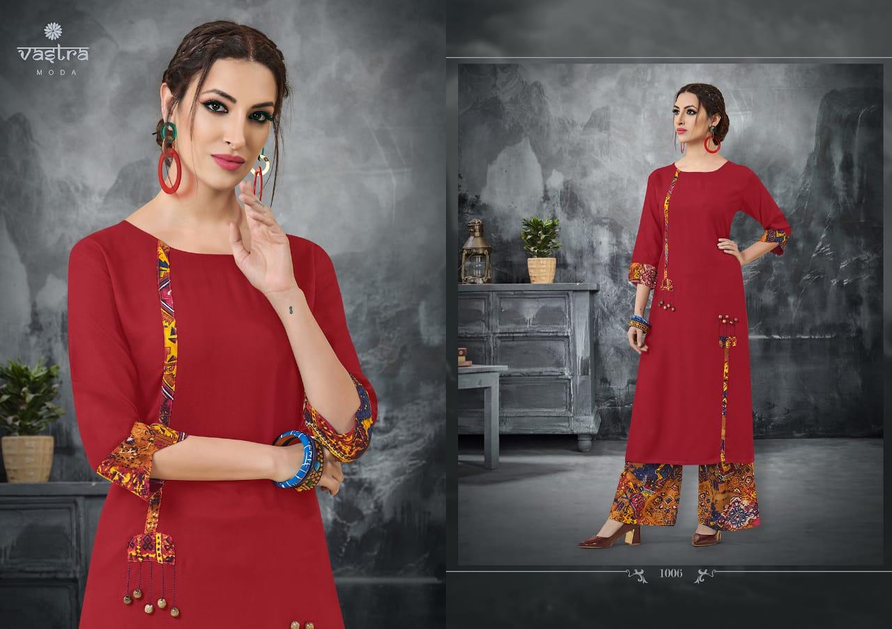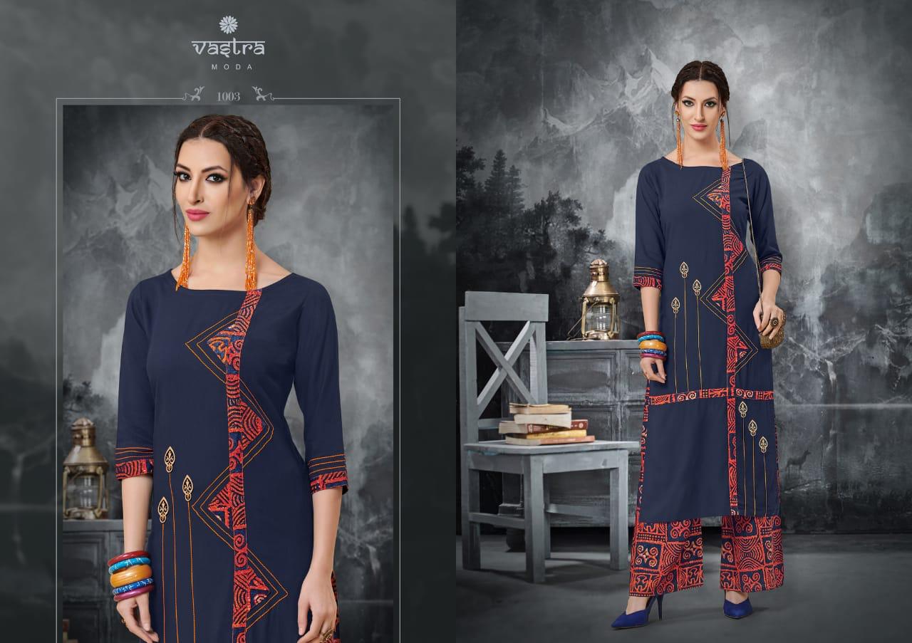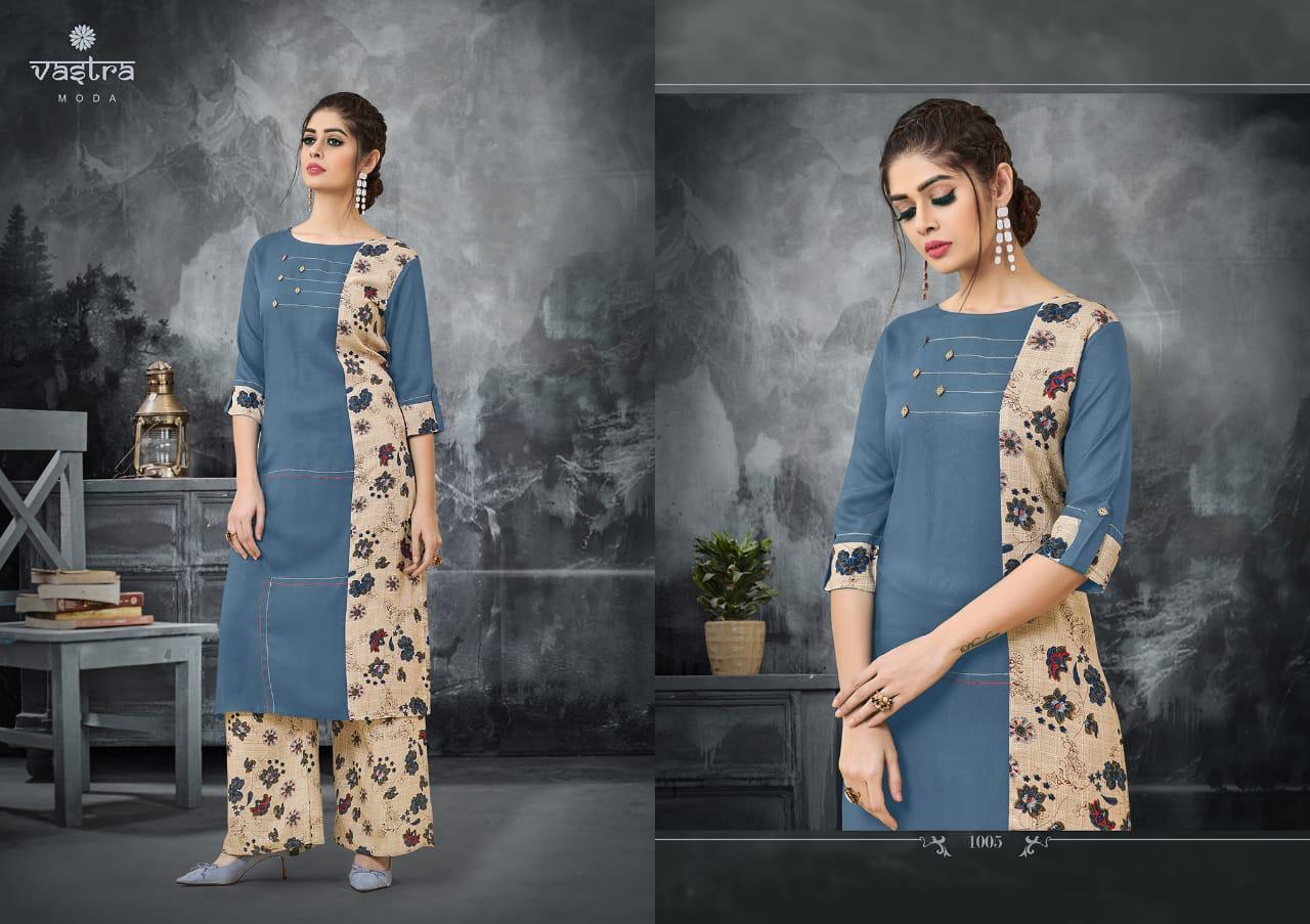 Buy Online Rhythm Vol 1 By Vastra Moda Reyon Cotton Kurtis With Plazzo Set Wholesale Supplier Surat 8 Pcs of Full Catalogue at Wholesale Price. Looking for Rhythm Vol 1 By Vastra Moda Reyon Cotton Kurtis With Plazzo Set Wholesale Supplier Surat Full Catalouge at Best Price? Buy Now Rhythm Vol 1 By Vastra Moda Reyon Cotton Kurtis With Plazzo Set Wholesale Supplier Surat at Wholesale Rate of Rs 5560 with Total 8 Pcs from authroized dealer and supplier of Brand. Cost of Each piece is just only Rs 695 which is very low and affordable price to resale the product in your retail store ,This is Surat based Wholesale Supplier & Dealer of Brand. Click on Brand name to Know more about Brand's products.Call or Whatsapp on 9898838984 for booking or enquiry