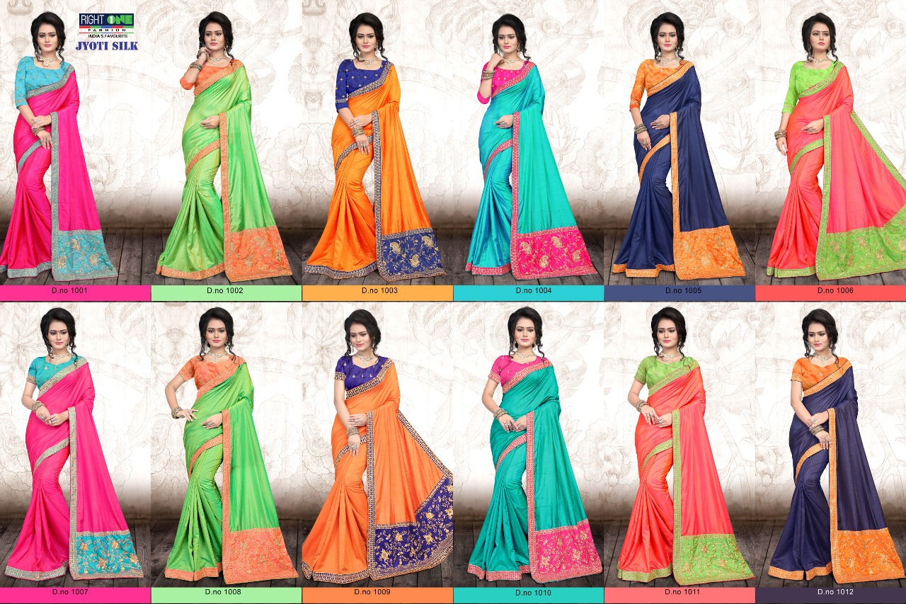 Buy Online Right One Jyoti Silk 1001 Series Designer Sana Silk Saree Collection Wholesaler And Supplier Surat 12 Pcs of Full Catalogue at Wholesale Price. Looking for Right One Jyoti Silk 1001 Series Designer Sana Silk Saree Collection Wholesaler And Supplier Surat Full Catalouge at Best Price? Buy Now Right One Jyoti Silk 1001 Series Designer Sana Silk Saree Collection Wholesaler And Supplier Surat at Wholesale Rate of Rs 8340 with Total 12 Pcs from authroized dealer and supplier of Right one Brand. Cost of Each piece is just only Rs 695 which is very low and affordable price to resale the product in your retail store ,This is Surat based Wholesale Supplier & Dealer of Right one Brand. Click on Brand name to Know more about Right one Brand's products.Call or Whatsapp on 9898838984 for booking or enquiry