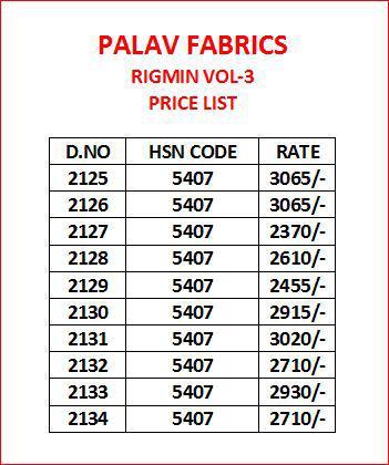 Brand - PALAV FABRIC. Catlog name - RIGMIN VOL -3. Series - 2125 to 2134. * set & Loose & Singel & Multiple * Single extra ? on company price list GST 5 Percent Extra. Delivery- Running |