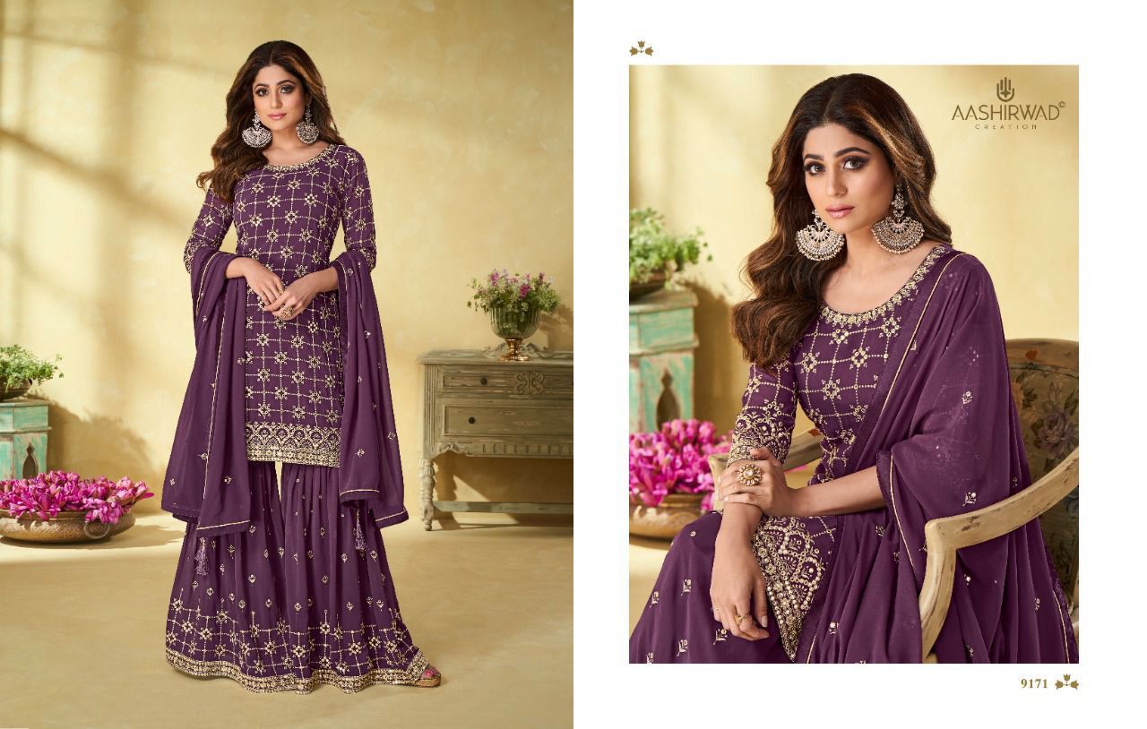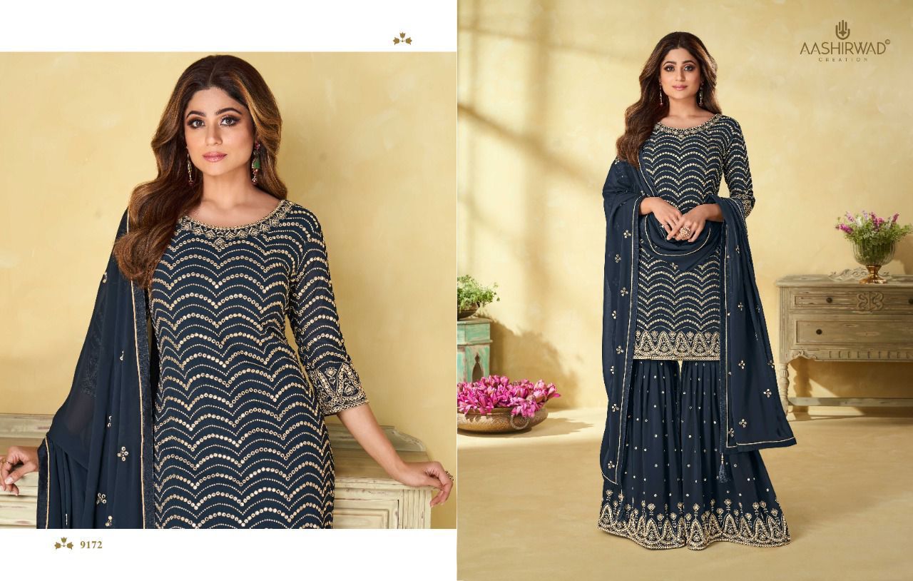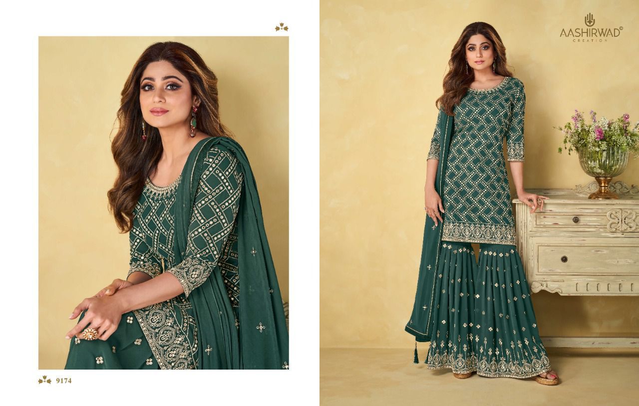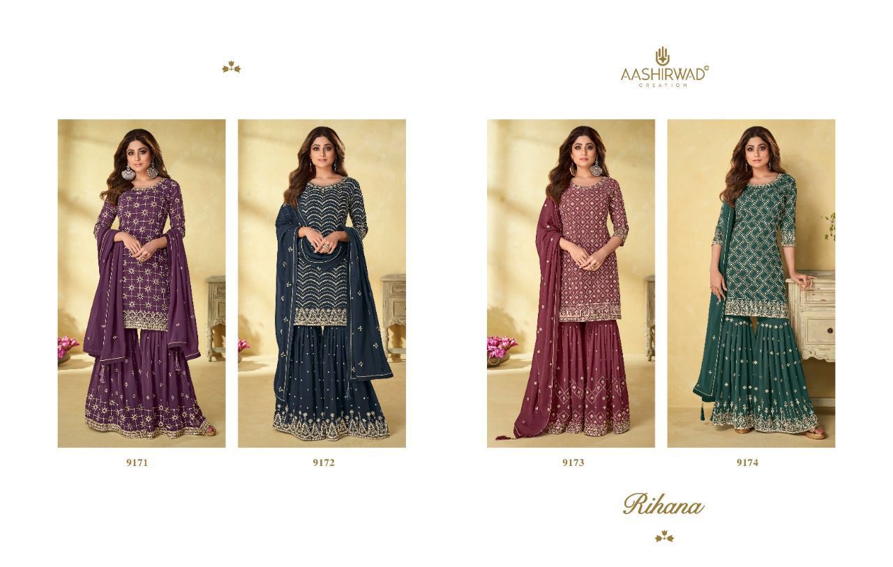 Buy Online Rihana Series 9171 To 9174 By Aashirwad Creation Designer Suit Single And Set Stockiest And Supplier From Surat 4 Pcs of Full Catalogue at Wholesale Price. Looking for Rihana Series 9171 To 9174 By Aashirwad Creation Designer Suit Single And Set Stockiest And Supplier From Surat Full Catalouge at Best Price? Buy Now Rihana Series 9171 To 9174 By Aashirwad Creation Designer Suit Single And Set Stockiest And Supplier From Surat at Wholesale Rate of Rs 9180 with Total 4 Pcs from authroized dealer and supplier of AASHIRWAD Brand. Cost of Each piece is just only Rs 2295 which is very low and affordable price to resale the product in your retail store ,This is Surat based Wholesale Supplier & Dealer of AASHIRWAD Brand. Click on Brand name to Know more about AASHIRWAD Brand's products.Call or Whatsapp on 9898838984 for booking or enquiry