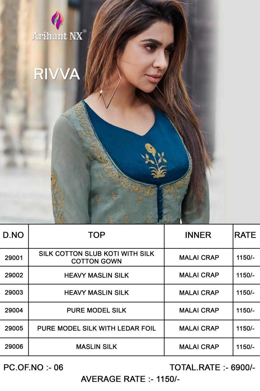Buy Online Rivaa By Arihant Nx Series 29001 To 29006 Designer Party Wear Gowns Wholesale Supplier Gujarat 6 Pcs of Full Catalogue at Wholesale Price. Looking for Rivaa By Arihant Nx Series 29001 To 29006 Designer Party Wear Gowns Wholesale Supplier Gujarat Full Catalouge at Best Price? Buy Now Rivaa By Arihant Nx Series 29001 To 29006 Designer Party Wear Gowns Wholesale Supplier Gujarat at Wholesale Rate of Rs 6900 with Total 6 Pcs from authroized dealer and supplier of ARIHANT NX Brand. Cost of Each piece is just only Rs 1150 which is very low and affordable price to resale the product in your retail store ,This is Surat based Wholesale Supplier & Dealer of ARIHANT NX Brand. Click on Brand name to Know more about ARIHANT NX Brand's products.Call or Whatsapp on 9898838984 for booking or enquiry
