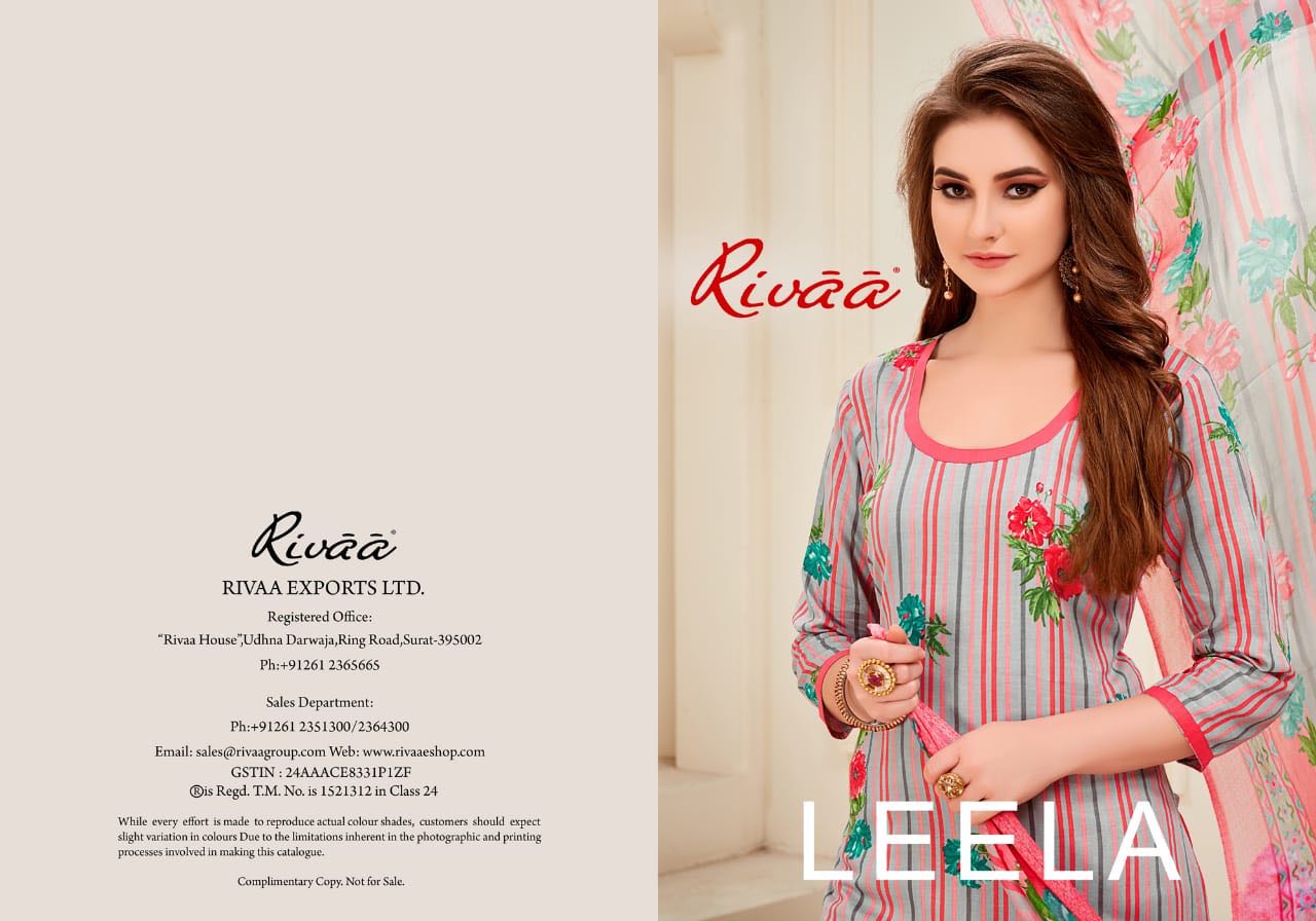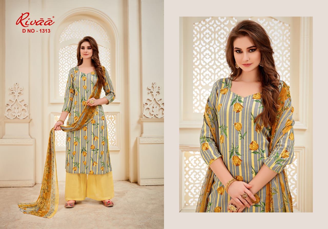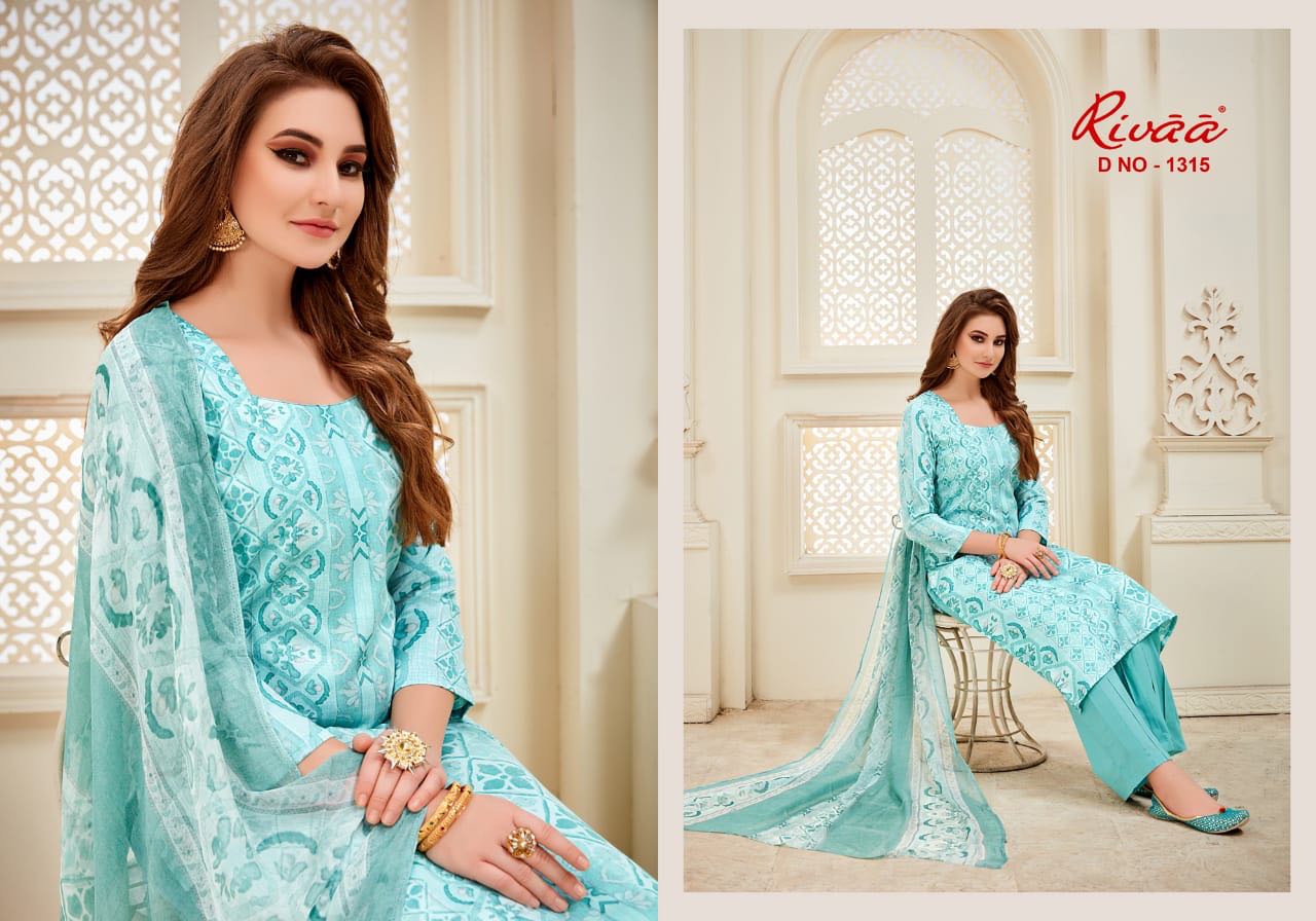 Buy Online Rivaa Leela 1313 Series Cotton Satin Printed Salwar Kameez Catlog Wholesale Dealer And Supplier Surat 7 Pcs of Full Catalogue at Wholesale Price. Looking for Rivaa Leela 1313 Series Cotton Satin Printed Salwar Kameez Catlog Wholesale Dealer And Supplier Surat Full Catalouge at Best Price? Buy Now Rivaa Leela 1313 Series Cotton Satin Printed Salwar Kameez Catlog Wholesale Dealer And Supplier Surat at Wholesale Rate of Rs 5250 with Total 7 Pcs from authroized dealer and supplier of RIVAA Brand. Cost of Each piece is just only Rs 750 which is very low and affordable price to resale the product in your retail store ,This is Surat based Wholesale Supplier & Dealer of RIVAA Brand. Click on Brand name to Know more about RIVAA Brand's products.Call or Whatsapp on 9898838984 for booking or enquiry
