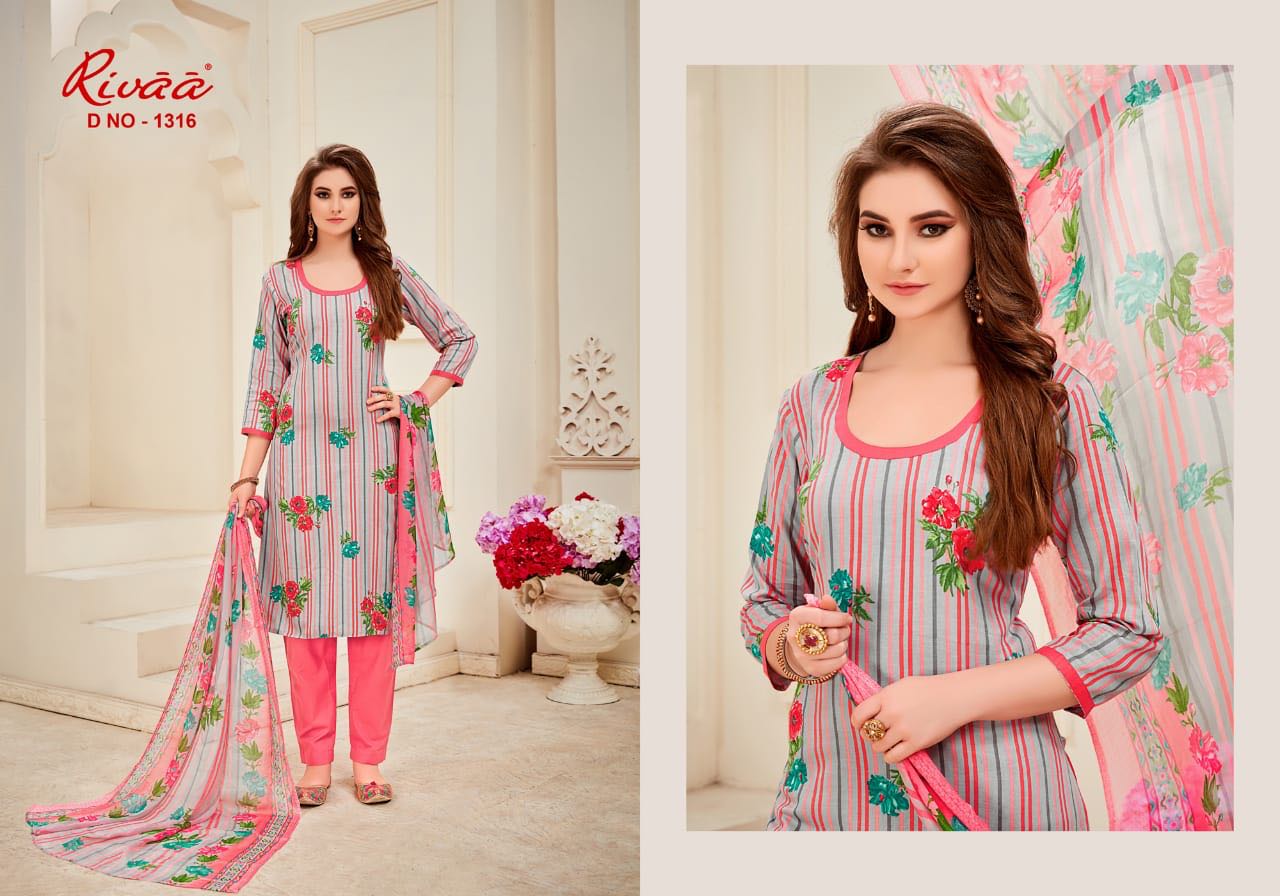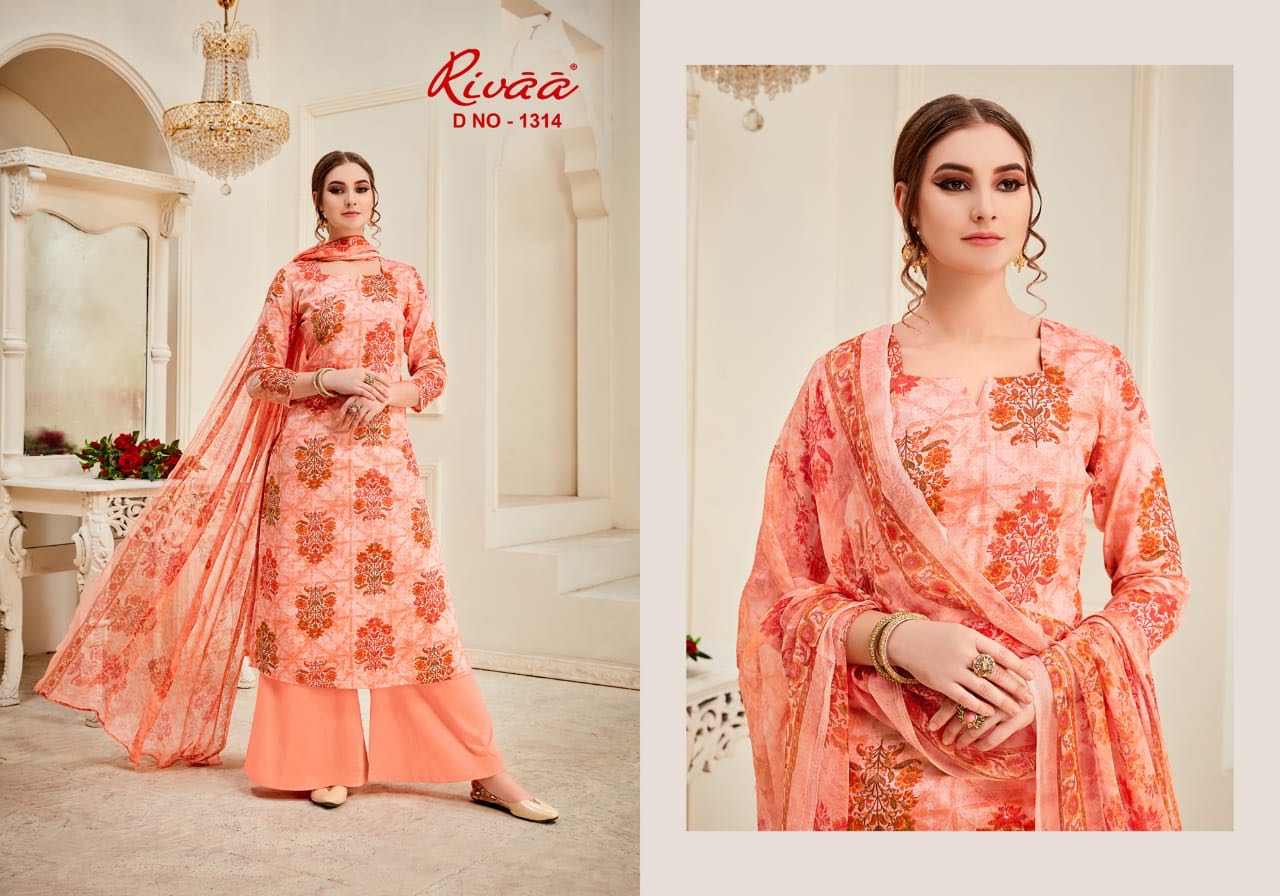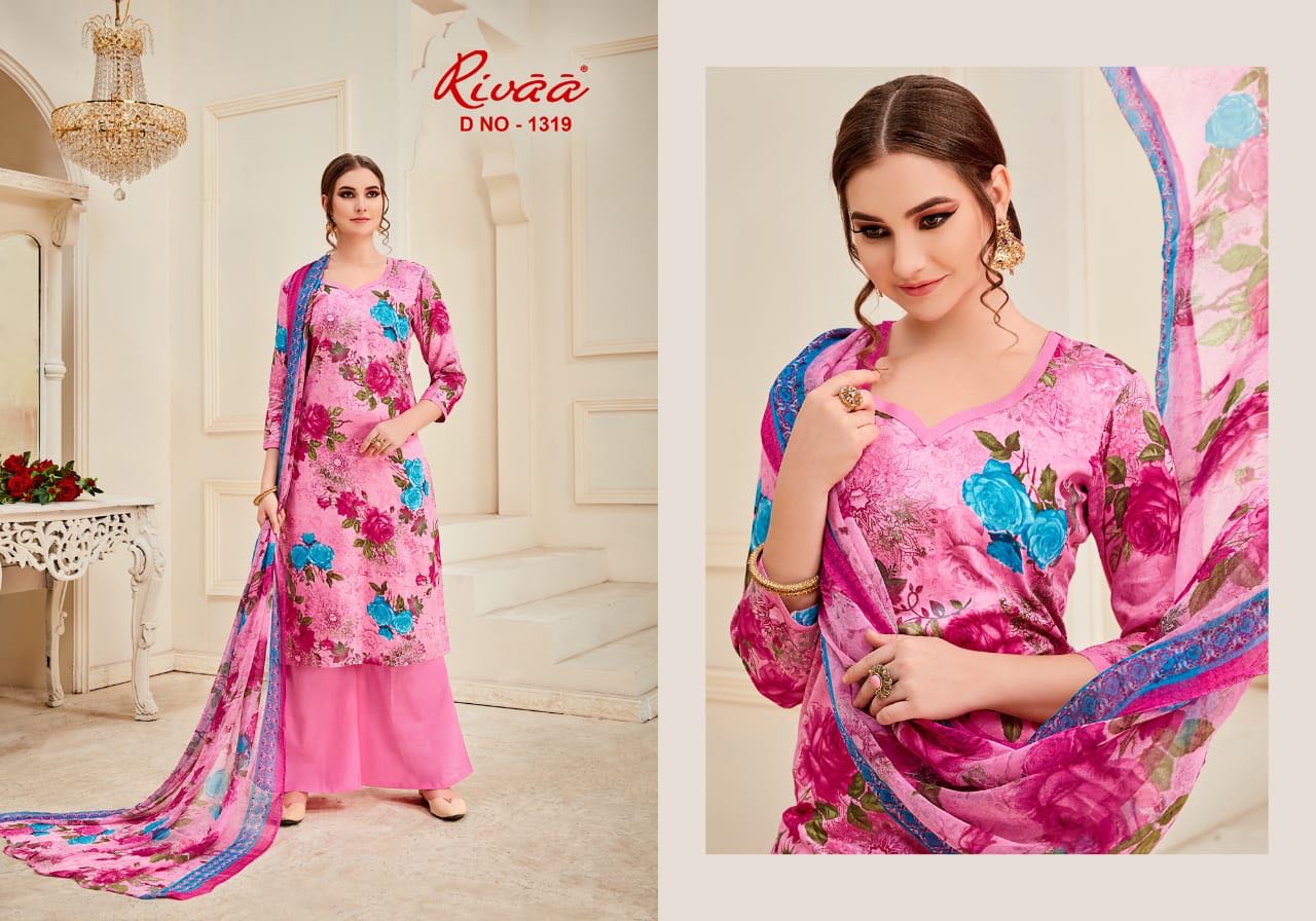 Buy Online Rivaa Leela 1313 Series Cotton Satin Printed Salwar Kameez Catlog Wholesale Dealer And Supplier Surat 7 Pcs of Full Catalogue at Wholesale Price. Looking for Rivaa Leela 1313 Series Cotton Satin Printed Salwar Kameez Catlog Wholesale Dealer And Supplier Surat Full Catalouge at Best Price? Buy Now Rivaa Leela 1313 Series Cotton Satin Printed Salwar Kameez Catlog Wholesale Dealer And Supplier Surat at Wholesale Rate of Rs 5250 with Total 7 Pcs from authroized dealer and supplier of RIVAA Brand. Cost of Each piece is just only Rs 750 which is very low and affordable price to resale the product in your retail store ,This is Surat based Wholesale Supplier & Dealer of RIVAA Brand. Click on Brand name to Know more about RIVAA Brand's products.Call or Whatsapp on 9898838984 for booking or enquiry