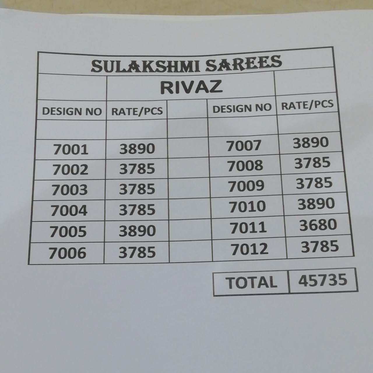 Buy Online Rivaz By Sulakshmi Saree Single And Set Stockiest And Supplier From Surat 12 Pcs of Full Catalogue at Wholesale Price. Looking for Rivaz By Sulakshmi Saree Single And Set Stockiest And Supplier From Surat Full Catalouge at Best Price? Buy Now Rivaz By Sulakshmi Saree Single And Set Stockiest And Supplier From Surat at Wholesale Rate of Rs 0 with Total 12 Pcs from authroized dealer and supplier of Brand. Cost of Each piece is just only Rs 0 which is very low and affordable price to resale the product in your retail store ,This is Surat based Wholesale Supplier & Dealer of Brand. Click on Brand name to Know more about Brand's products.Call or Whatsapp on 9898838984 for booking or enquiry