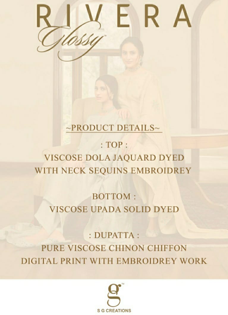 *Brand :* glossy *Catalog Name :* Rivera *Price :* ?1995 *Piece :* 8 *Total Price :* 15960 ( GST Extra ) *Size :* Unstitched *Fabric :* viscose *Availibility :* On Booking |