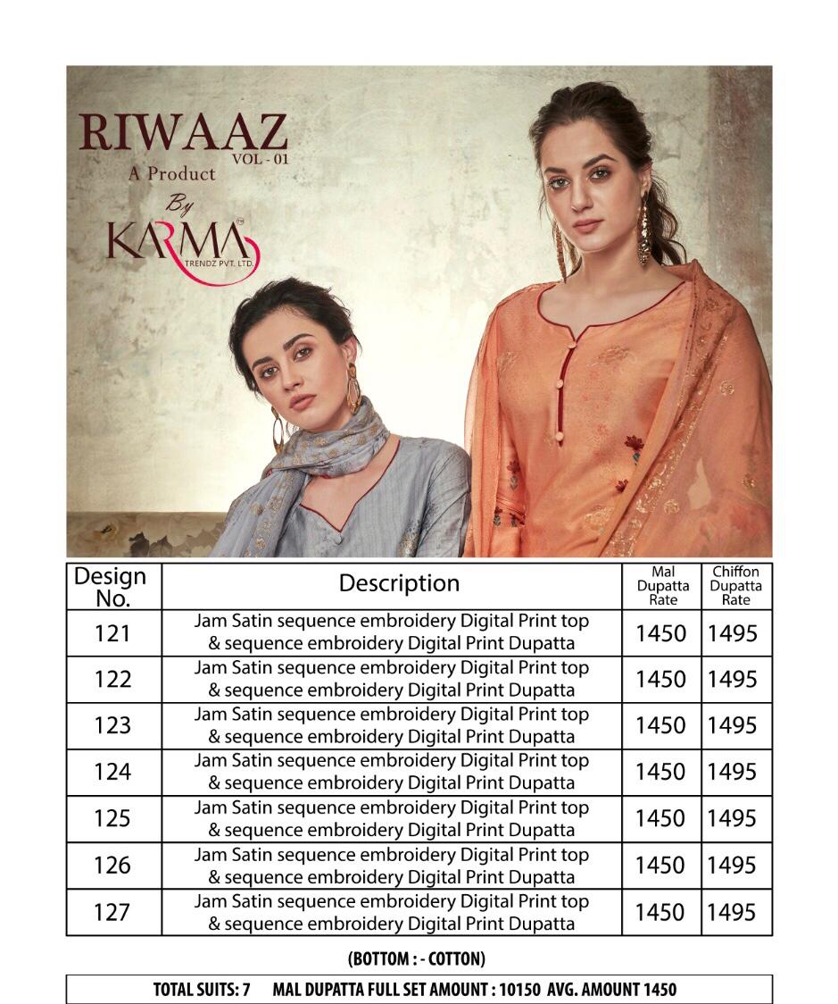 Buy Online Riwaaz Vol 1 By Karma Series 121 To 127 Designer Party Wear Suits Wholesale Supplier Gujarat 7 Pcs of Full Catalogue at Wholesale Price. Looking for Riwaaz Vol 1 By Karma Series 121 To 127 Designer Party Wear Suits Wholesale Supplier Gujarat Full Catalouge at Best Price? Buy Now Riwaaz Vol 1 By Karma Series 121 To 127 Designer Party Wear Suits Wholesale Supplier Gujarat at Wholesale Rate of Rs 10150 with Total 7 Pcs from authroized dealer and supplier of KARMA Brand. Cost of Each piece is just only Rs 1450 which is very low and affordable price to resale the product in your retail store ,This is Surat based Wholesale Supplier & Dealer of KARMA Brand. Click on Brand name to Know more about KARMA Brand's products.Call or Whatsapp on 9898838984 for booking or enquiry