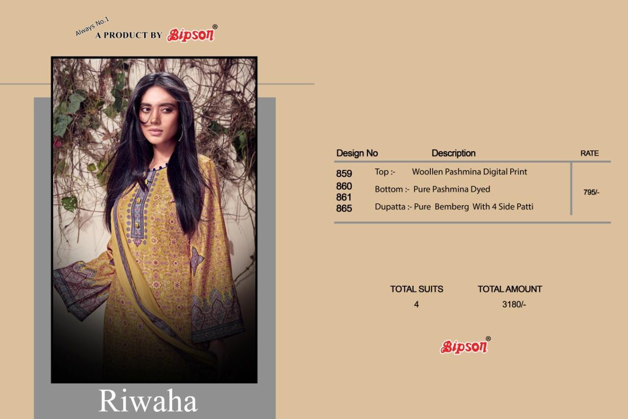 Buy Online Riwaha By Bipson Pashmina Suits Wholesale Supplier Nd Dealer Gujarat 4 Pcs of Full Catalogue at Wholesale Price. Looking for Riwaha By Bipson Pashmina Suits Wholesale Supplier Nd Dealer Gujarat Full Catalouge at Best Price? Buy Now Riwaha By Bipson Pashmina Suits Wholesale Supplier Nd Dealer Gujarat at Wholesale Rate of Rs 3180 with Total 4 Pcs from authroized dealer and supplier of Brand. Cost of Each piece is just only Rs 795 which is very low and affordable price to resale the product in your retail store ,This is Surat based Wholesale Supplier & Dealer of Brand. Click on Brand name to Know more about Brand's products.Call or Whatsapp on 9898838984 for booking or enquiry
