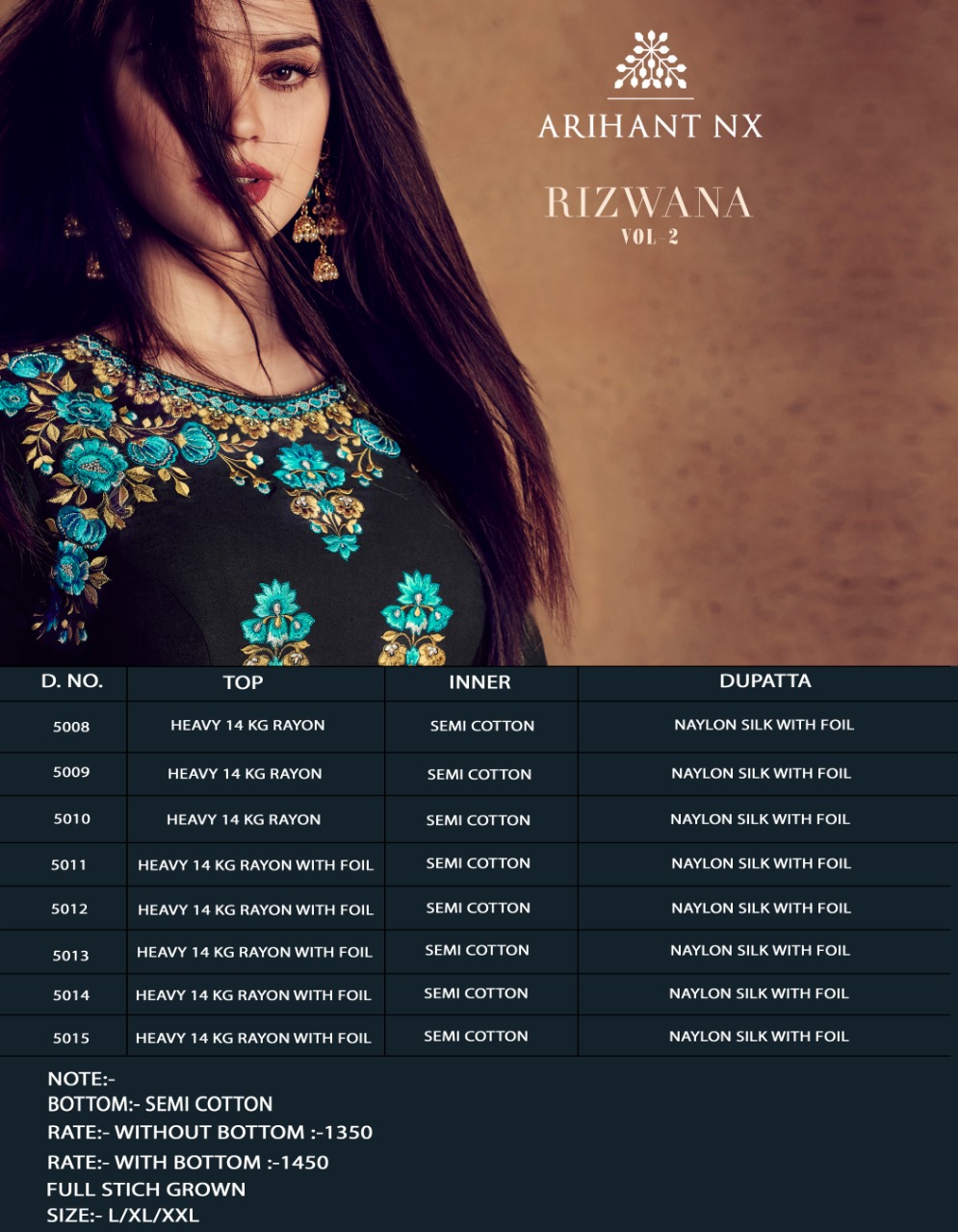 Buy Online Rizwana Vol 2 Series 5008 To 5015 By Arihant Nx Reyon Embroidered Desinger Gowns With Beautiful Duppata Catalogs Wholesale Supplier Nd Exporter Nitya Nx Surat 8 Pcs of Full Catalogue at Wholesale Price. Looking for Rizwana Vol 2 Series 5008 To 5015 By Arihant Nx Reyon Embroidered Desinger Gowns With Beautiful Duppata Catalogs Wholesale Supplier Nd Exporter Nitya Nx Surat Full Catalouge at Best Price? Buy Now Rizwana Vol 2 Series 5008 To 5015 By Arihant Nx Reyon Embroidered Desinger Gowns With Beautiful Duppata Catalogs Wholesale Supplier Nd Exporter Nitya Nx Surat at Wholesale Rate of Rs 10800 with Total 8 Pcs from authroized dealer and supplier of ARIHANT NX Brand. Cost of Each piece is just only Rs 1350 which is very low and affordable price to resale the product in your retail store ,This is Surat based Wholesale Supplier & Dealer of ARIHANT NX Brand. Click on Brand name to Know more about ARIHANT NX Brand's products.Call or Whatsapp on 9898838984 for booking or enquiry