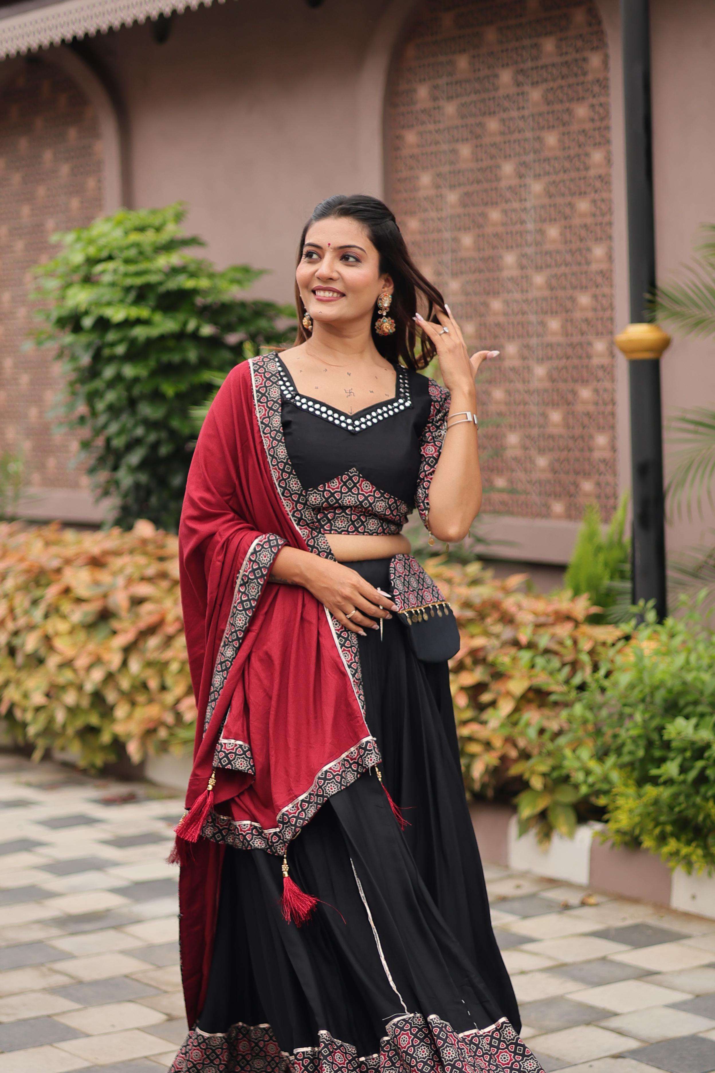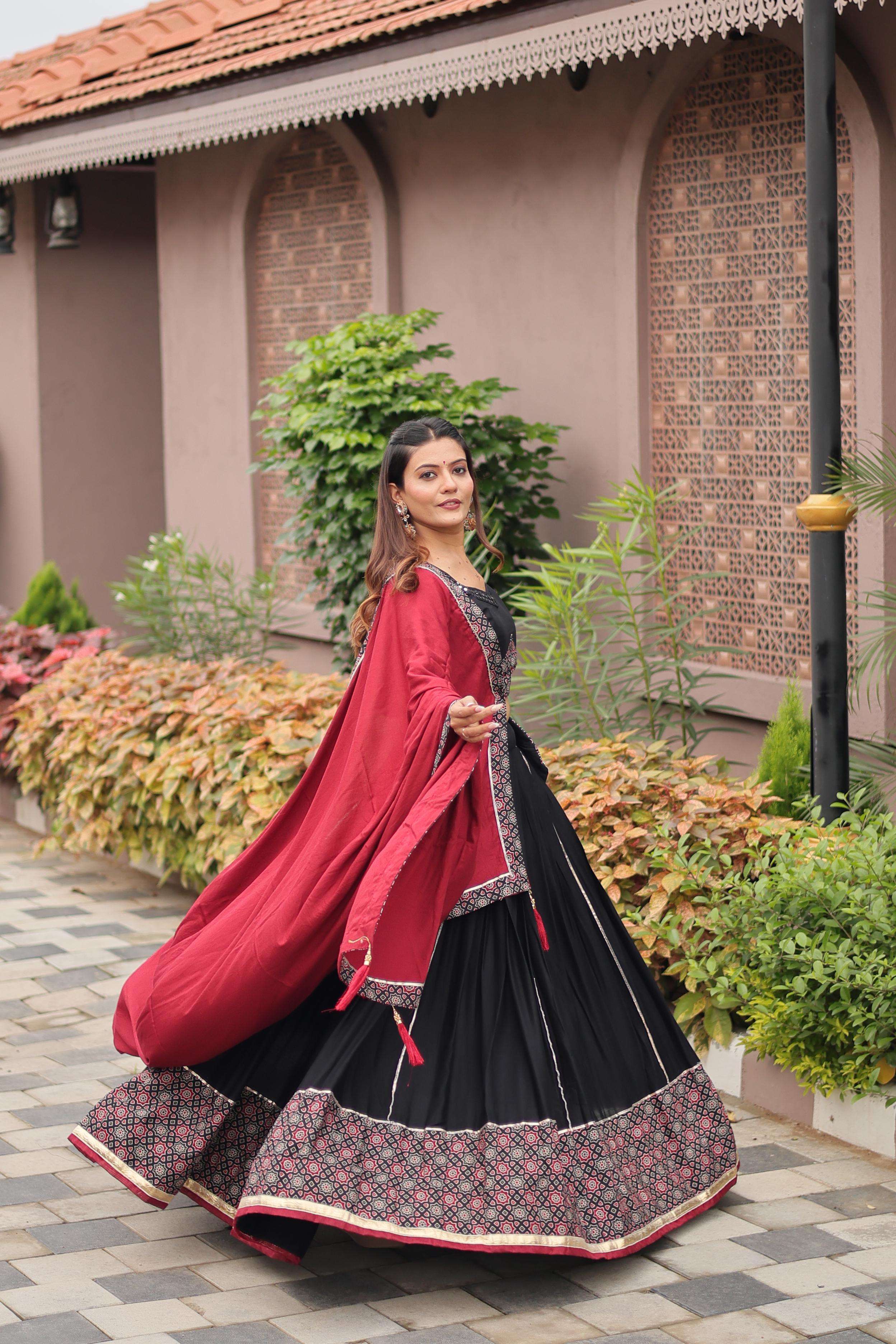 _Lehenga:_ _Fabric:_ Pure Cotton _Inner:_ Micro Cotton _Work:_ Pure Ajarakh & Ribbon with Lumpi Lace Border _Flair:_ 6 Meter _Size:_ 44 (Full-Stitched)