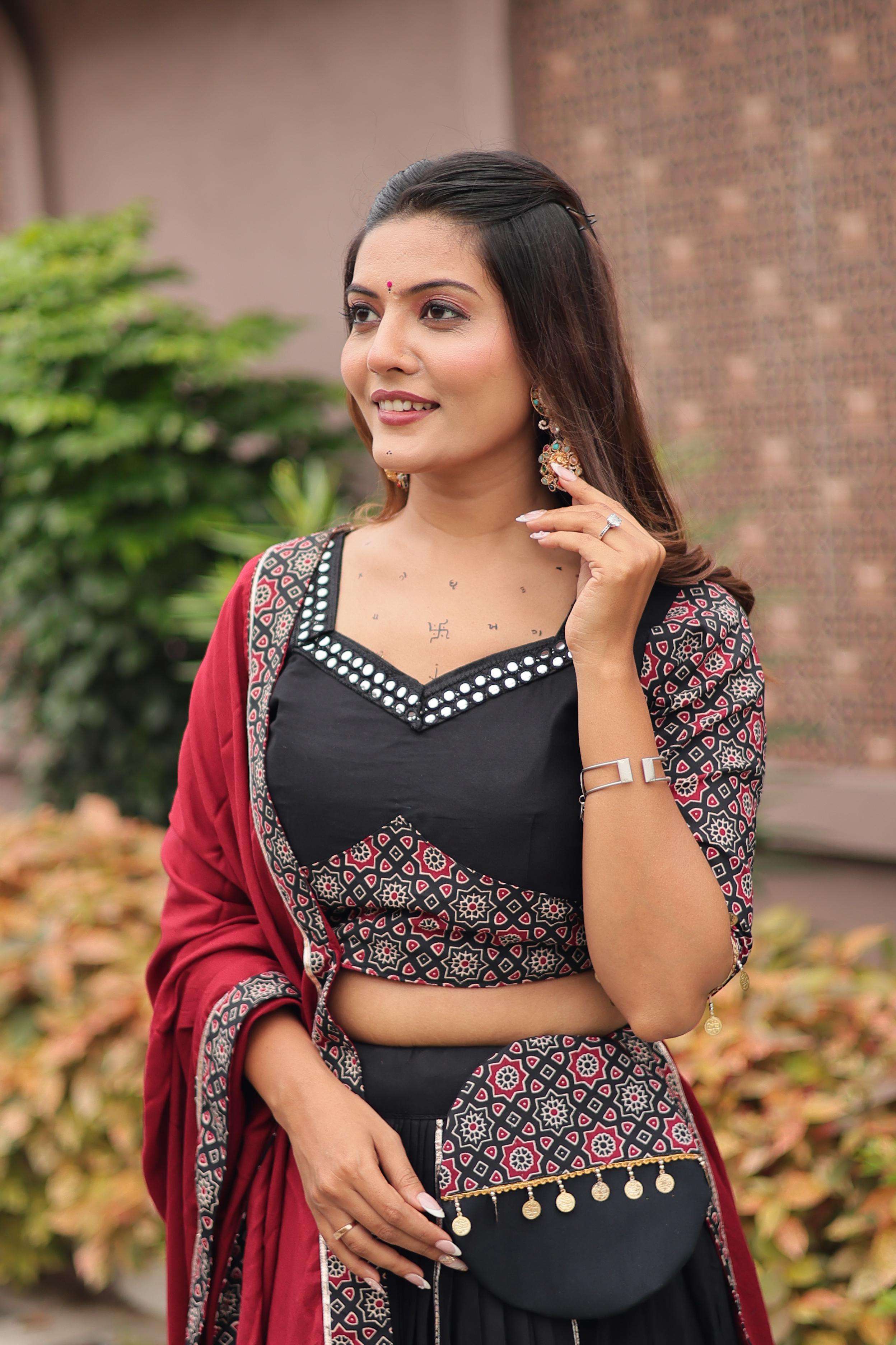 _Choli:_ _Fabric:_ Pure Cotton _Work:_ Heavy Mirror Lace & Ajarakh with Sikka Lace _Inner:_ Micro Cotton _Size:_ M upto L margin, XL upto 2XL margin (Fully Stitched)