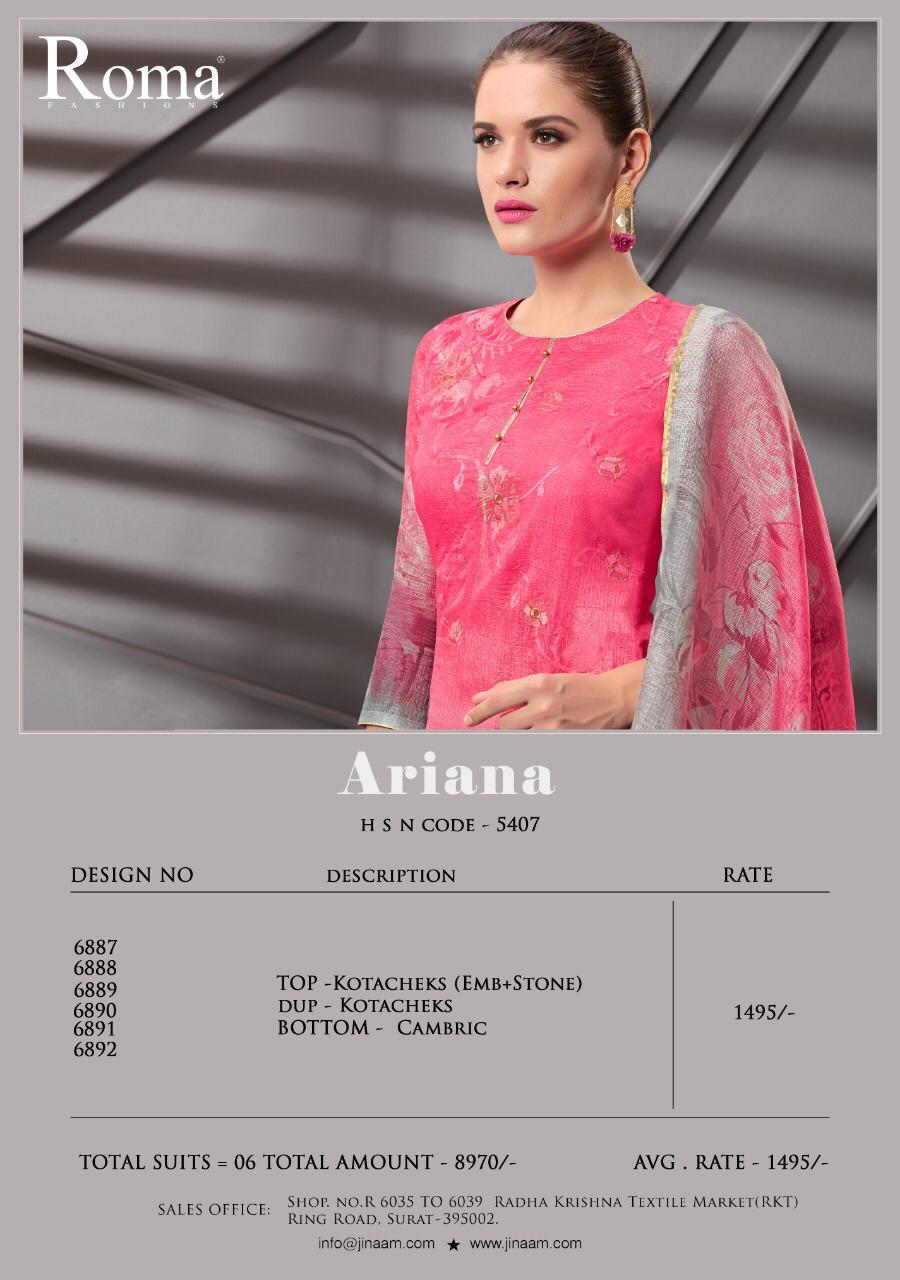 Buy Online Roma Ariana By Jdl Series 6887 To 6892 Digital Printed Kota Checks Embroidered Designer Suits Wholesale Supplier And Dealer Gujarat 6 Pcs of Full Catalogue at Wholesale Price. Looking for Roma Ariana By Jdl Series 6887 To 6892 Digital Printed Kota Checks Embroidered Designer Suits Wholesale Supplier And Dealer Gujarat Full Catalouge at Best Price? Buy Now Roma Ariana By Jdl Series 6887 To 6892 Digital Printed Kota Checks Embroidered Designer Suits Wholesale Supplier And Dealer Gujarat at Wholesale Rate of Rs 8970 with Total 6 Pcs from authroized dealer and supplier of JINAAM Brand. Cost of Each piece is just only Rs 1495 which is very low and affordable price to resale the product in your retail store ,This is Surat based Wholesale Supplier & Dealer of JINAAM Brand. Click on Brand name to Know more about JINAAM Brand's products.Call or Whatsapp on 9898838984 for booking or enquiry