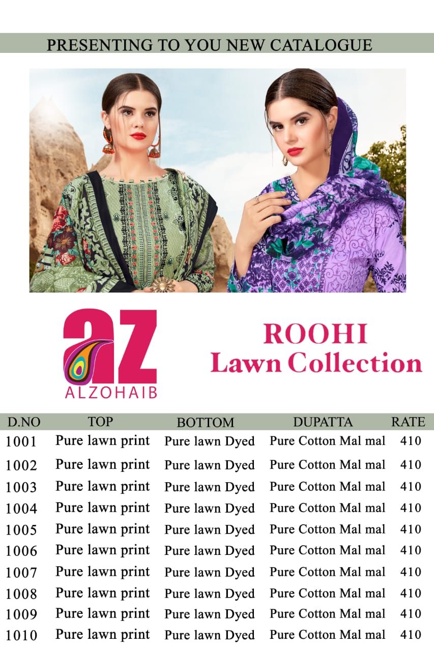 Buy Online Roohi Lawn Collection By Al Zohaib Lawn Dress Materials Wholesale Supplier Surat 10 Pcs of Full Catalogue at Wholesale Price. Looking for Roohi Lawn Collection By Al Zohaib Lawn Dress Materials Wholesale Supplier Surat Full Catalouge at Best Price? Buy Now Roohi Lawn Collection By Al Zohaib Lawn Dress Materials Wholesale Supplier Surat at Wholesale Rate of Rs 4100 with Total 10 Pcs from authroized dealer and supplier of Brand. Cost of Each piece is just only Rs 410 which is very low and affordable price to resale the product in your retail store ,This is Surat based Wholesale Supplier & Dealer of Brand. Click on Brand name to Know more about Brand's products.Call or Whatsapp on 9898838984 for booking or enquiry