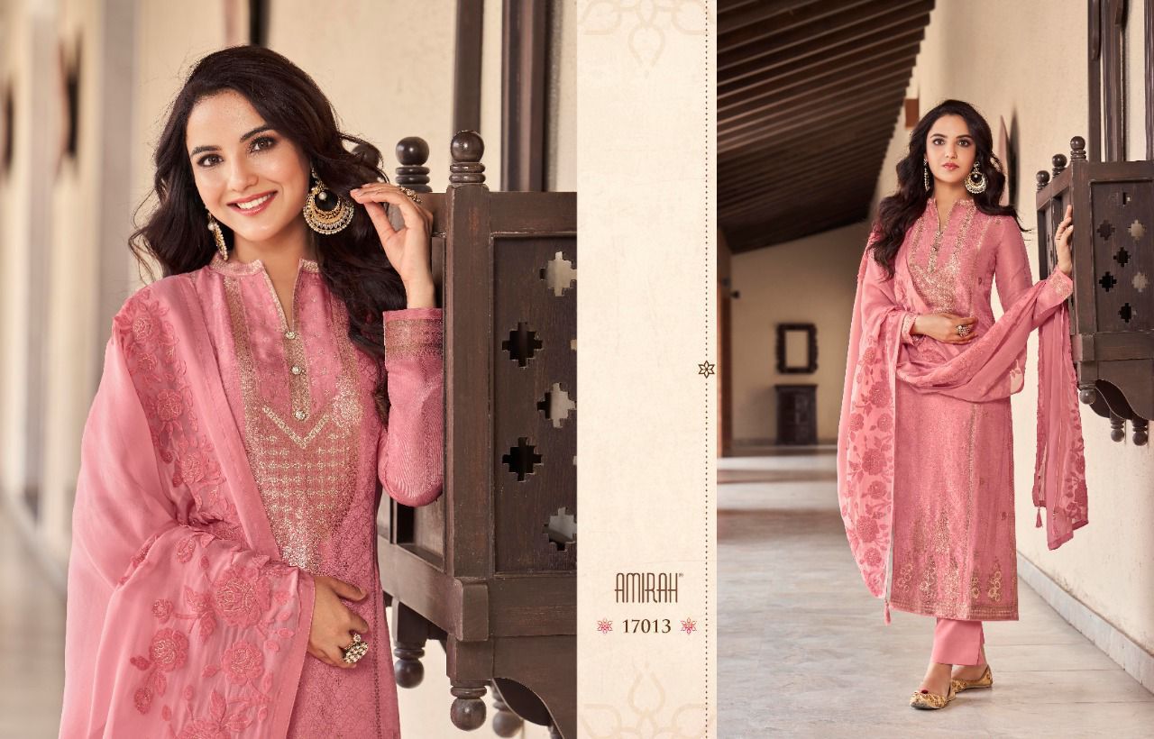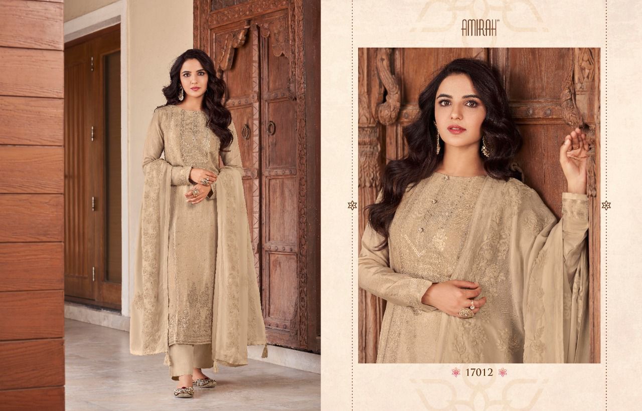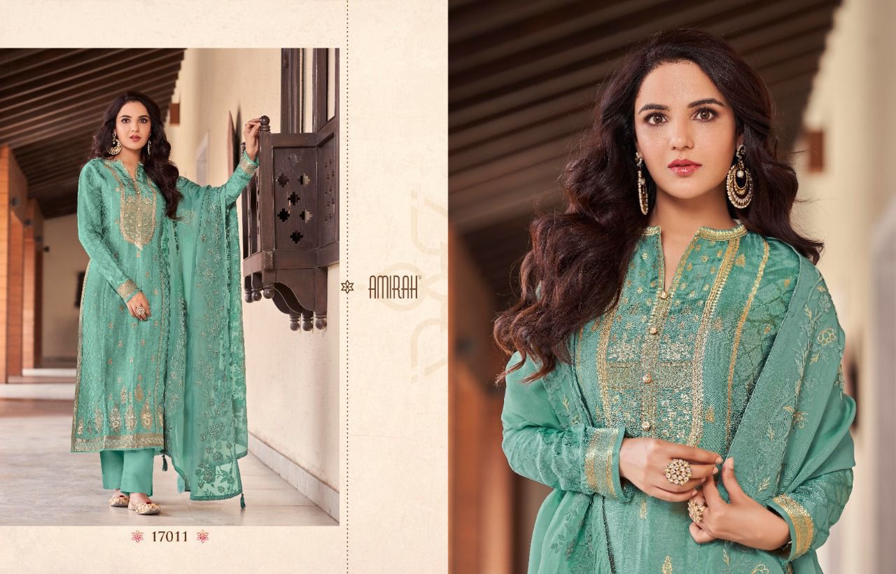 *"AMIRAH"*_ BRAND CREATED BY YOU..... *Â?*FANTASTIC "**collection of.......6 designs....... * AMIRAH ROOP* Fabric Details:- ? Top : - *PURE VISCOS DOLA JAQARD * INER BOTTOM :- DULL SANTOON.... ??Dup. : - * HABUTAI SILK SOFT ORGANZA WITH APLIC WORKÂ?.* ? *Per PCs Rate: 1895/- + G.s.t* Set to set Delivery 2 days |