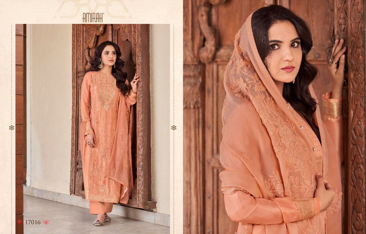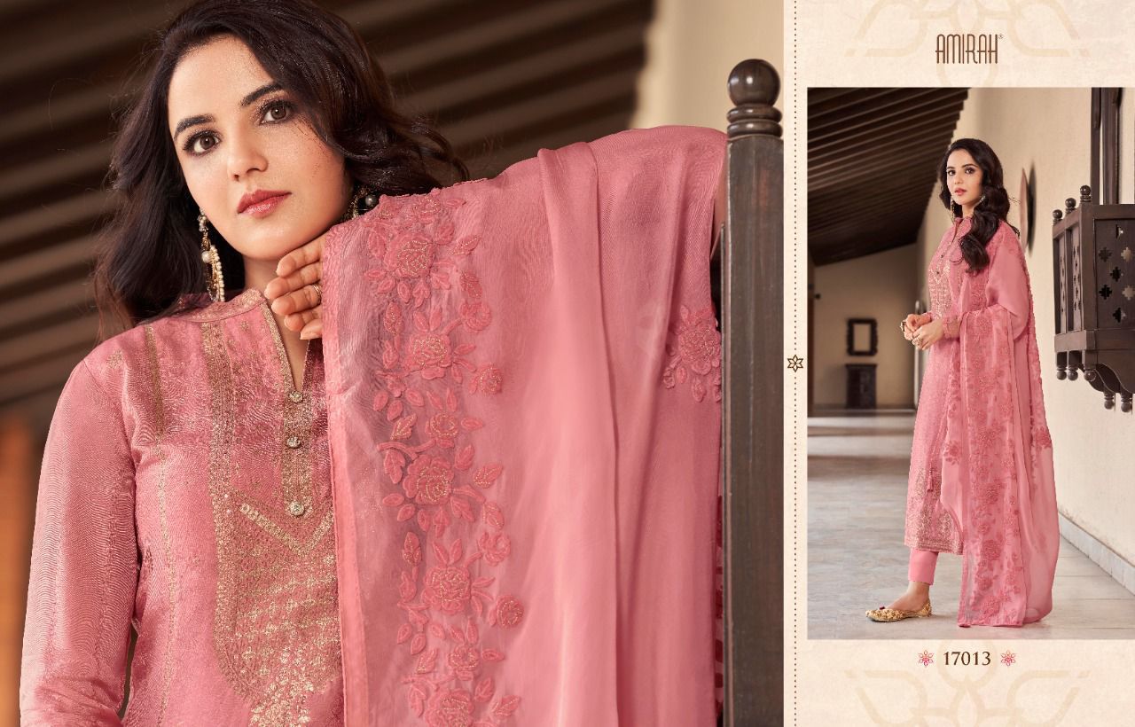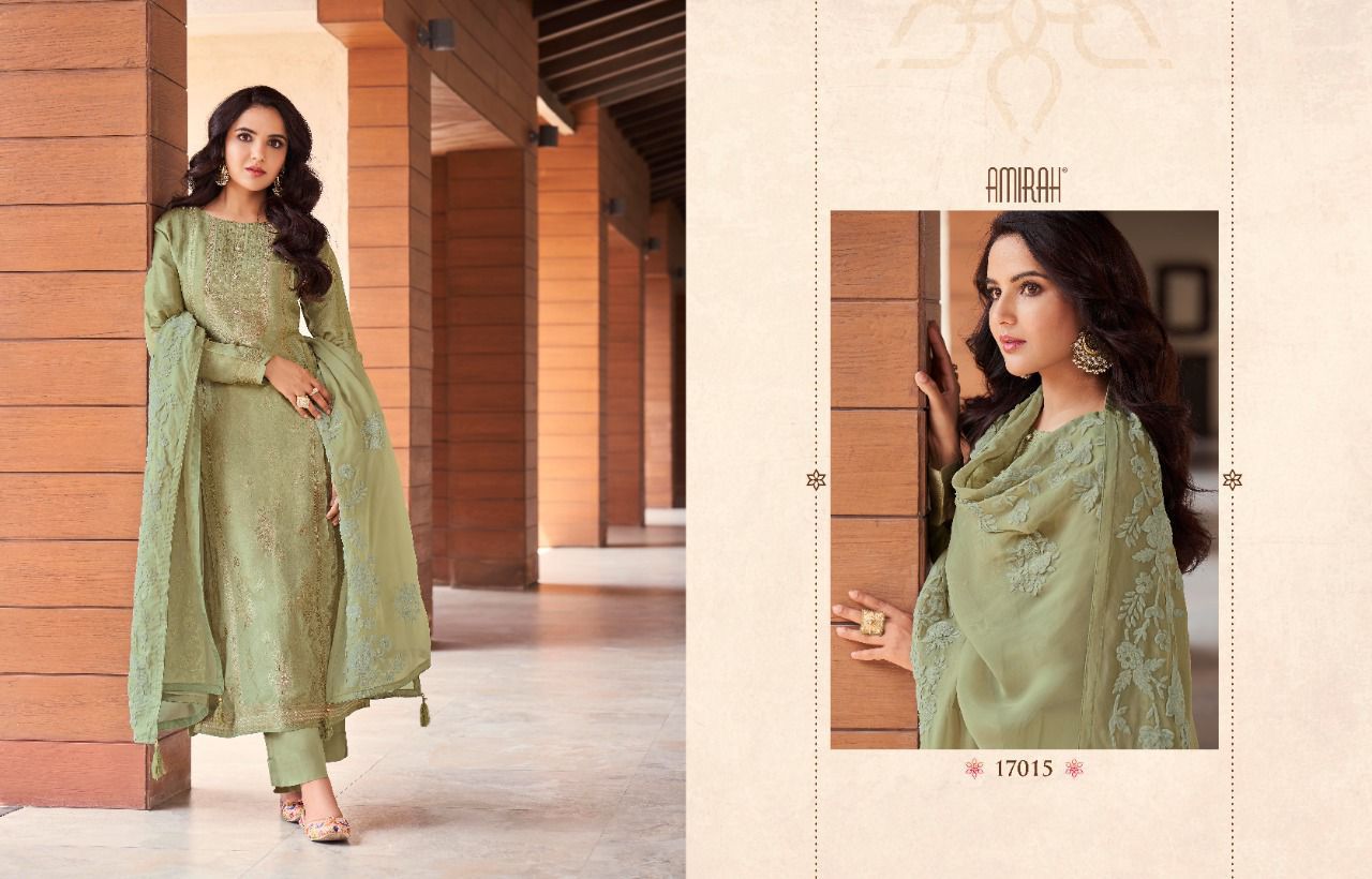 *"AMIRAH"*_ BRAND CREATED BY YOU..... *Â?*FANTASTIC "**collection of.......6 designs....... * AMIRAH ROOP* Fabric Details:- ? Top : - *PURE VISCOS DOLA JAQARD * INER BOTTOM :- DULL SANTOON.... ??Dup. : - * HABUTAI SILK SOFT ORGANZA WITH APLIC WORKÂ?.* ? *Per PCs Rate: 1895/- + G.s.t* Set to set Delivery 2 days |