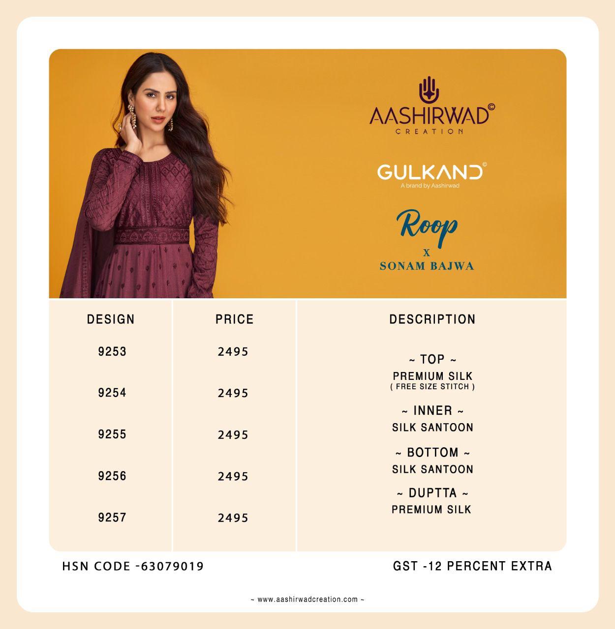 Buy Online Roop Series 9253 To 9257 By Gulkand By Aashirwad Creation Designer Suit Single And Set Stockiest And Supplier From Surat 5 Pcs of Full Catalogue at Wholesale Price. Looking for Roop Series 9253 To 9257 By Gulkand By Aashirwad Creation Designer Suit Single And Set Stockiest And Supplier From Surat Full Catalouge at Best Price? Buy Now Roop Series 9253 To 9257 By Gulkand By Aashirwad Creation Designer Suit Single And Set Stockiest And Supplier From Surat at Wholesale Rate of Rs 12475 with Total 5 Pcs from authroized dealer and supplier of AASHIRWAD Brand. Cost of Each piece is just only Rs 2495 which is very low and affordable price to resale the product in your retail store ,This is Surat based Wholesale Supplier & Dealer of AASHIRWAD Brand. Click on Brand name to Know more about AASHIRWAD Brand's products.Call or Whatsapp on 9898838984 for booking or enquiry