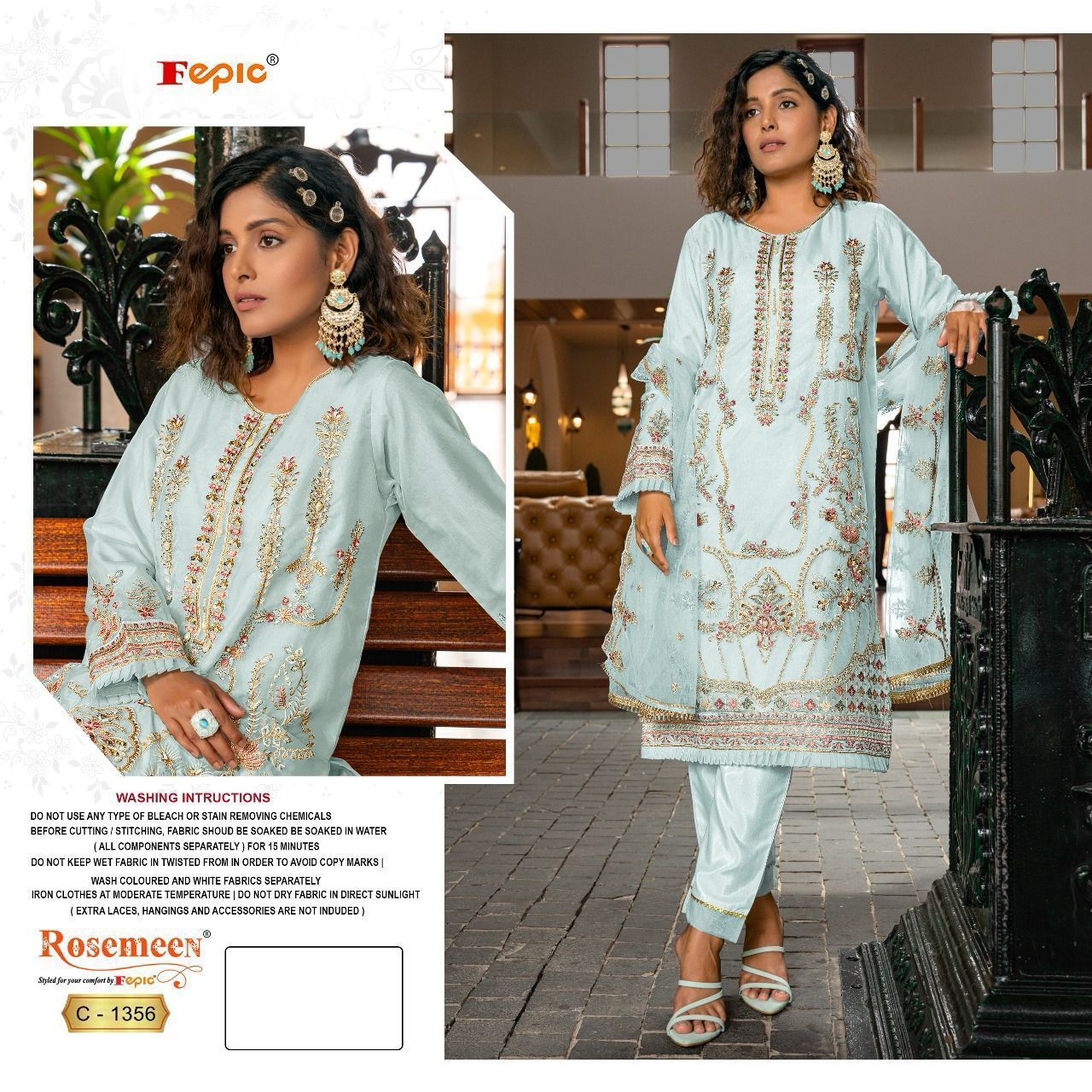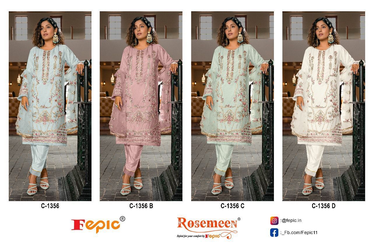 Buy Online Rosemeen C 1356 By Fepic Organza Embroidered Pakistani Suits 4 Pcs of Full Catalogue at Wholesale Price. Looking for Rosemeen C 1356 By Fepic Organza Embroidered Pakistani Suits Full Catalouge at Best Price? Buy Now Rosemeen C 1356 By Fepic Organza Embroidered Pakistani Suits at Wholesale Rate of Rs 5324 with Total 4 Pcs from authroized dealer and supplier of FEPIC Brand. Cost of Each piece is just only Rs 1331 which is very low and affordable price to resale the product in your retail store ,This is Surat based Wholesale Supplier & Dealer of FEPIC Brand. Click on Brand name to Know more about FEPIC Brand's products.Call or Whatsapp on 9898838984 for booking or enquiry