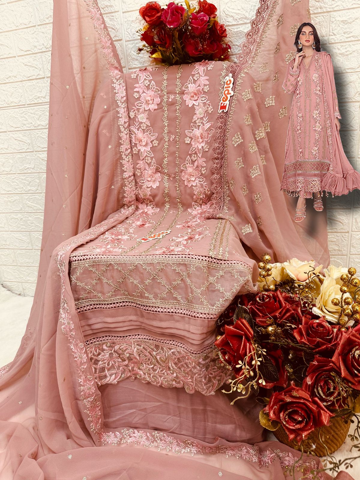 _*BRAND NAME*_:- FEPIC _*CATALOUGE NAME*_:- ROSEMEEN _*D NO*_:- C 1609 _*Top*_:- GEORGETTE EMBROIDERED WITH APLIQUE WORK _*Dupatta*_:- GEORGETTE EMBROIDERED _*Bottom*_:- SANTOON _*INNER*_:- SANTOON _* RATE*_:-1311/- GST SHIP EXTRA 100+single |