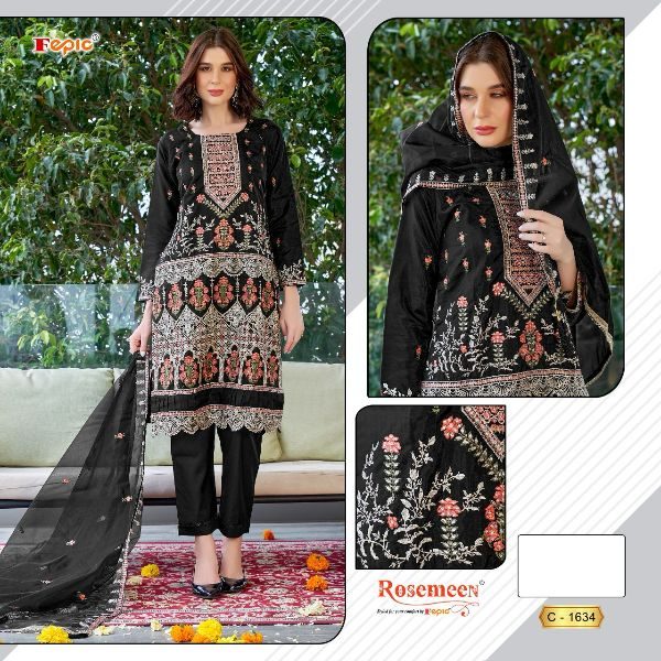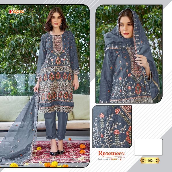 BRAND NAME:- FEPIC CATALOUGE NAME:- ROSEMEEN D NO:- C 1634 Top:- ORGANZA EMBROIDERED WITH HEAVY HANDWORK Dupatta:- ORGANZA EMBROIDERED Bottom:- SANTOON INNER:- SANTOON _* RATE*_:-1399/- 100+ SINGLE |