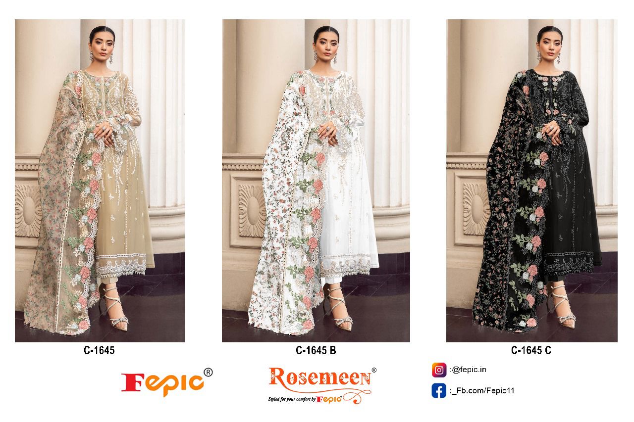 Buy Online Rosemeen C 1645 Georgette Embroidered Pakistani Concept Single Avilable Wholesaler Supplier Surat 3 Pcs of Full Catalogue at Wholesale Price. Looking for Rosemeen C 1645 Georgette Embroidered Pakistani Concept Single Avilable Wholesaler Supplier Surat Full Catalouge at Best Price? Buy Now Rosemeen C 1645 Georgette Embroidered Pakistani Concept Single Avilable Wholesaler Supplier Surat at Wholesale Rate of Rs 4065 with Total 3 Pcs from authroized dealer and supplier of FEPIC Brand. Cost of Each piece is just only Rs 1355 which is very low and affordable price to resale the product in your retail store ,This is Surat based Wholesale Supplier & Dealer of FEPIC Brand. Click on Brand name to Know more about FEPIC Brand's products.Call or Whatsapp on 9898838984 for booking or enquiry