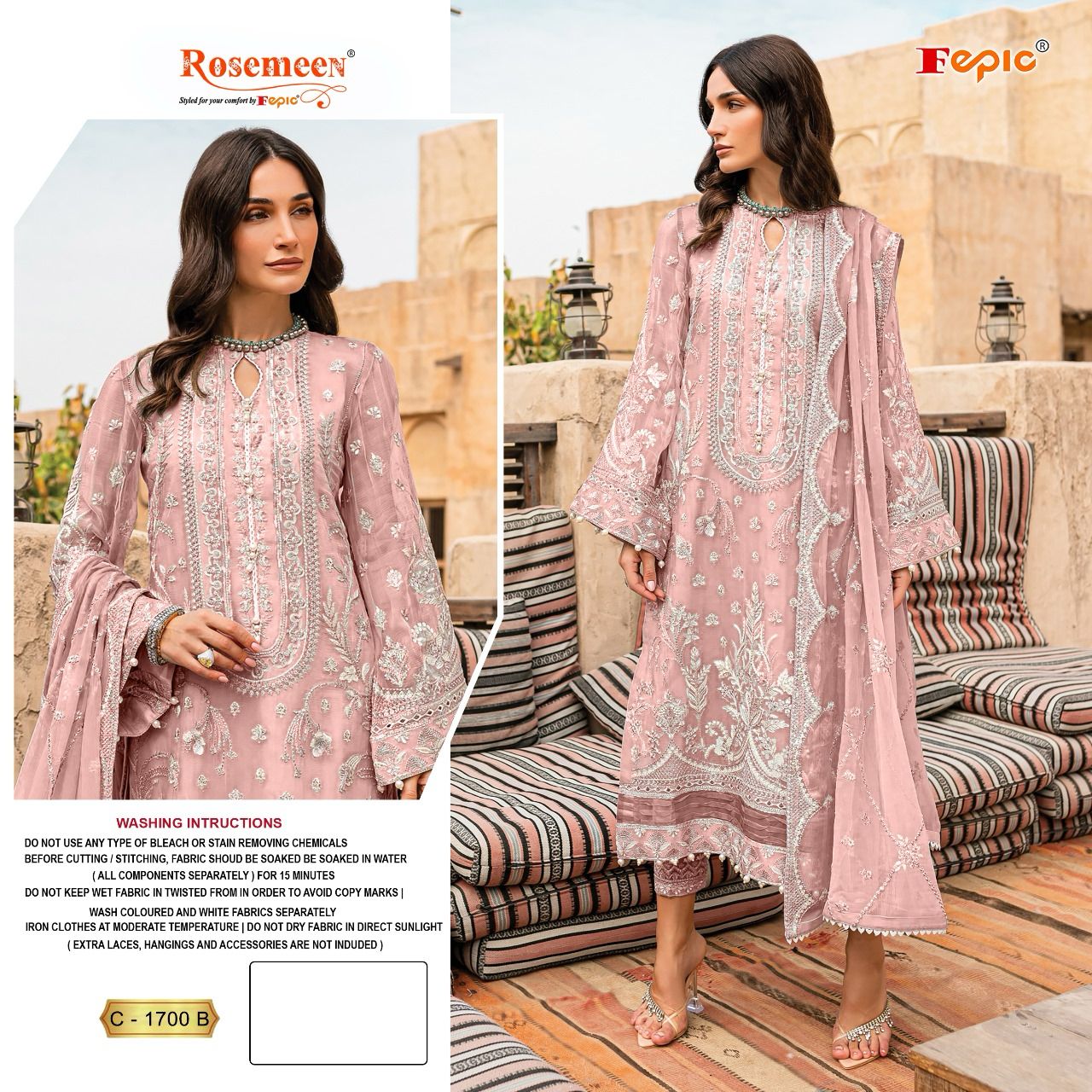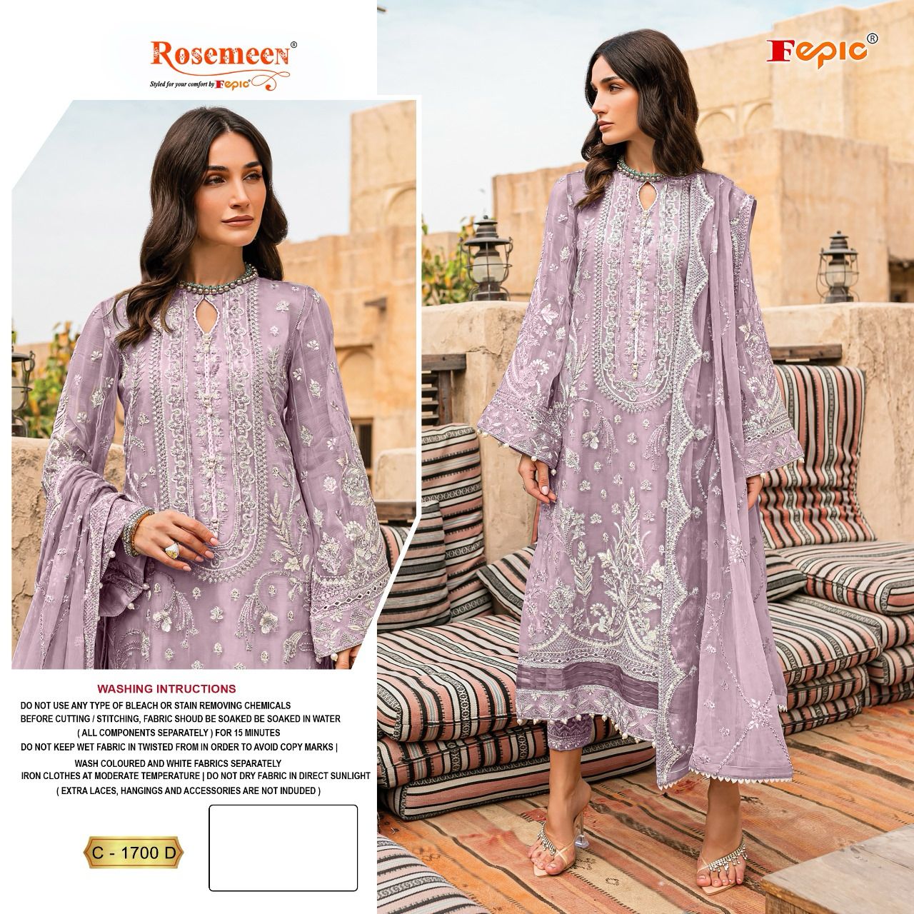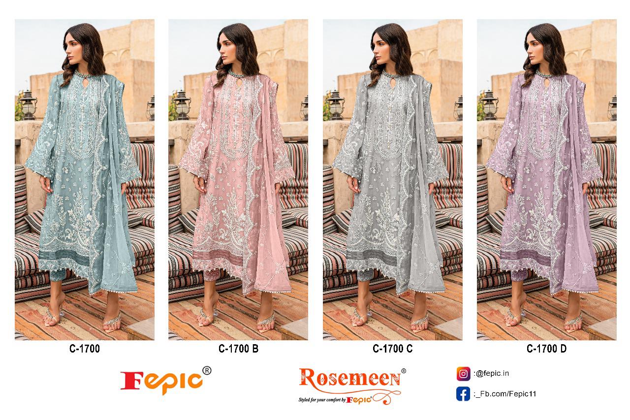 Buy Online Rosemeen C 1700 By Fepic Georgette Embroidered Pakistani Suits 4 Pcs of Full Catalogue at Wholesale Price. Looking for Rosemeen C 1700 By Fepic Georgette Embroidered Pakistani Suits Full Catalouge at Best Price? Buy Now Rosemeen C 1700 By Fepic Georgette Embroidered Pakistani Suits at Wholesale Rate of Rs 5596 with Total 4 Pcs from authroized dealer and supplier of FEPIC Brand. Cost of Each piece is just only Rs 1399 which is very low and affordable price to resale the product in your retail store ,This is Surat based Wholesale Supplier & Dealer of FEPIC Brand. Click on Brand name to Know more about FEPIC Brand's products.Call or Whatsapp on 9898838984 for booking or enquiry