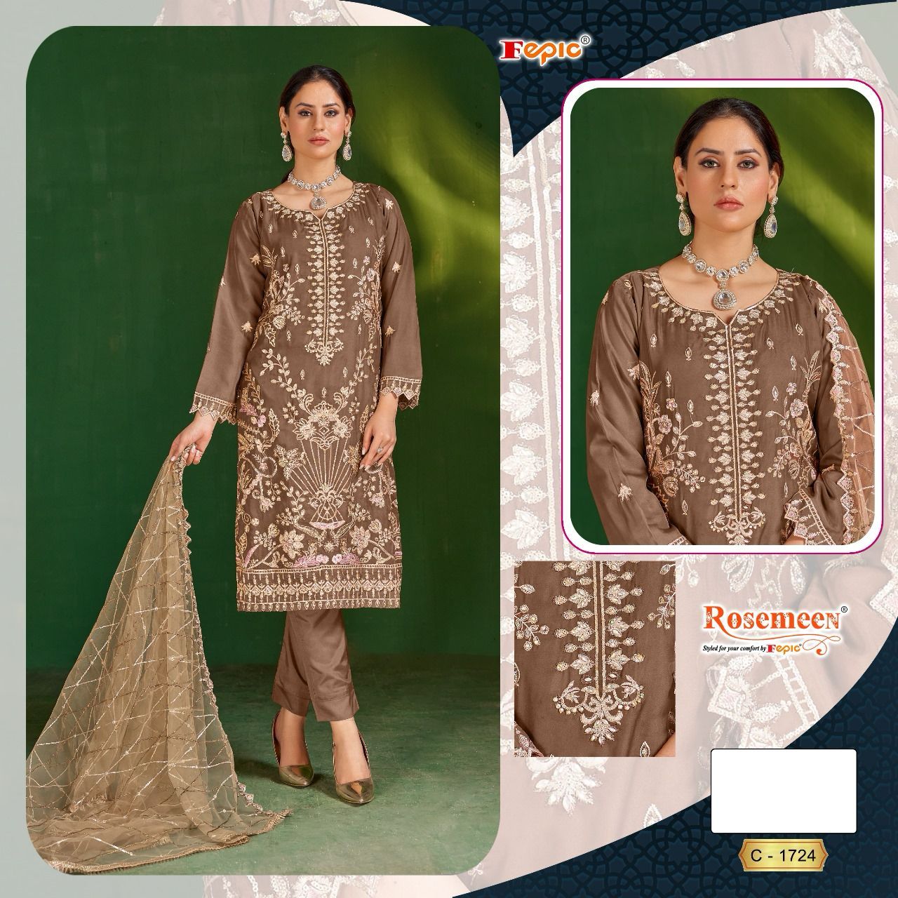 Buy Online Rosemeen C 1724 By Fepic Single Design Eid Collection Manufacturer Surat 5 Pcs of Full Catalogue at Wholesale Price. Looking for Rosemeen C 1724 By Fepic Single Design Eid Collection Manufacturer Surat Full Catalouge at Best Price? Buy Now Rosemeen C 1724 By Fepic Single Design Eid Collection Manufacturer Surat at Wholesale Rate of Rs 6105 with Total 5 Pcs from authroized dealer and supplier of FEPIC Brand. Cost of Each piece is just only Rs 1221 which is very low and affordable price to resale the product in your retail store ,This is Surat based Wholesale Supplier & Dealer of FEPIC Brand. Click on Brand name to Know more about FEPIC Brand's products.Call or Whatsapp on 9898838984 for booking or enquiry
