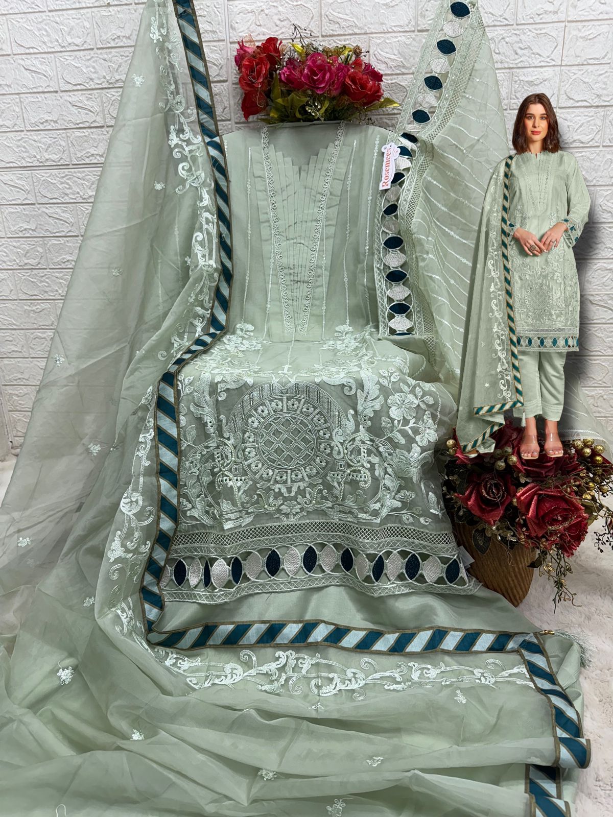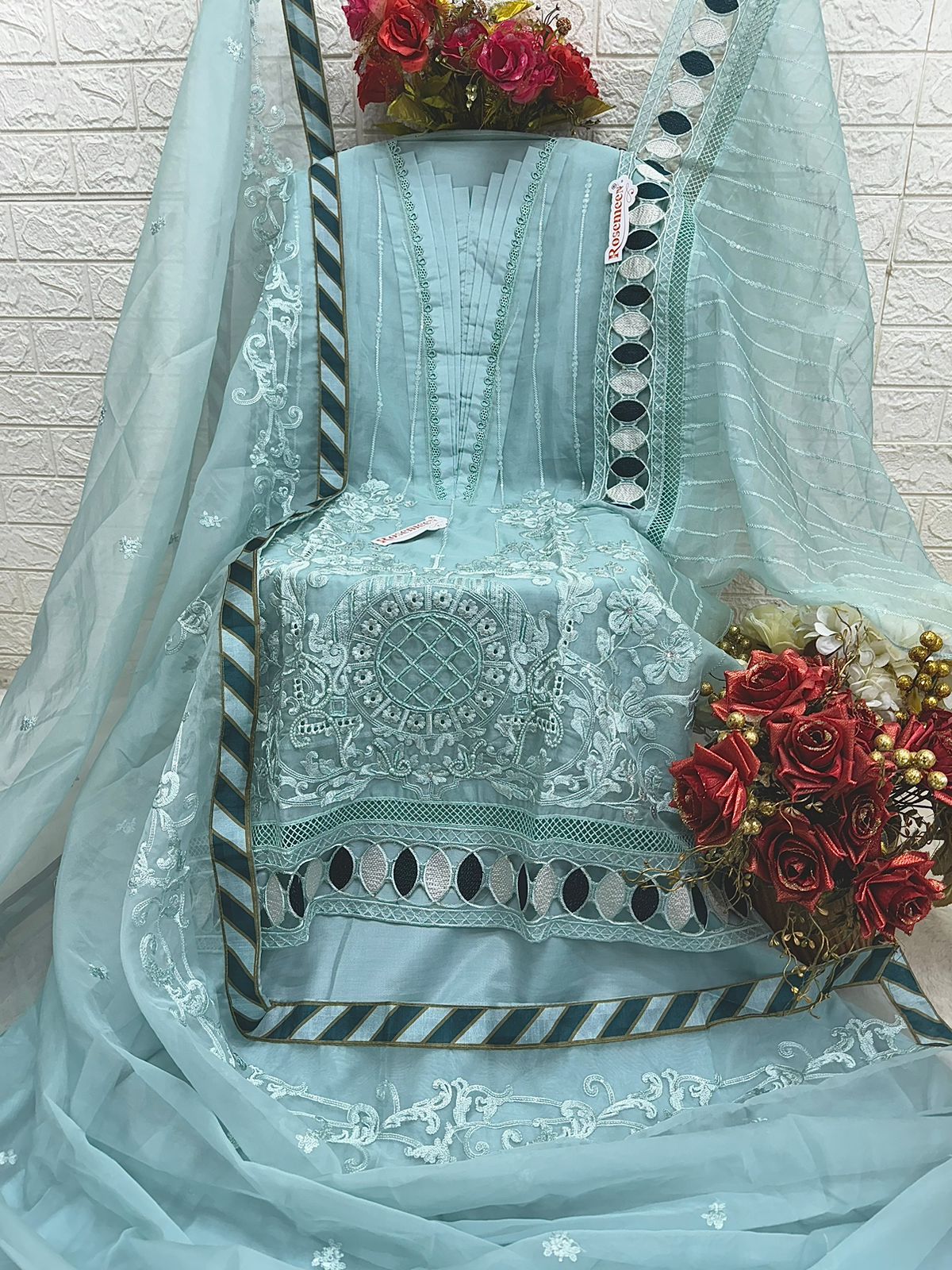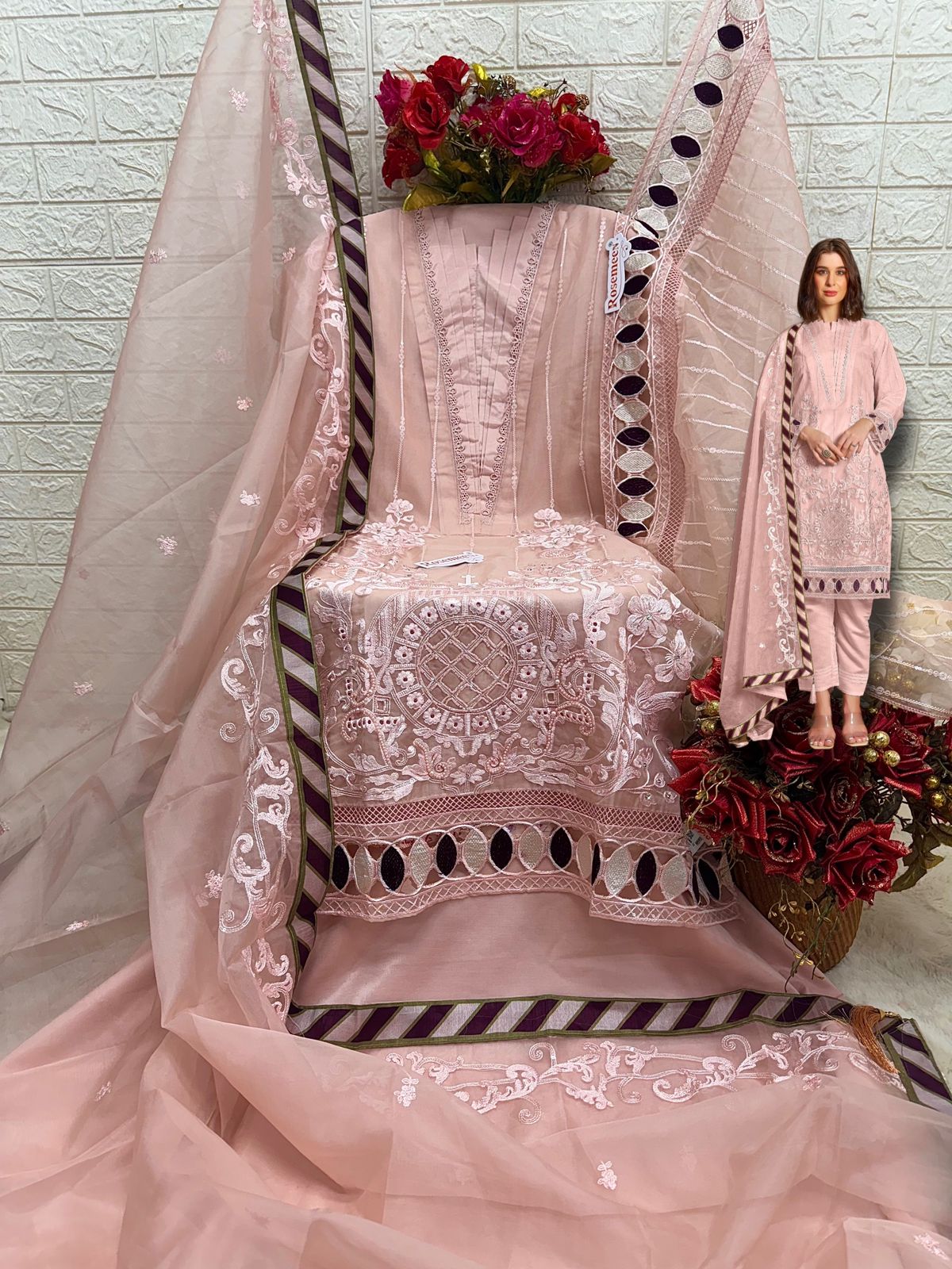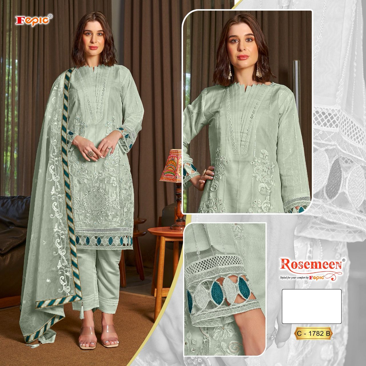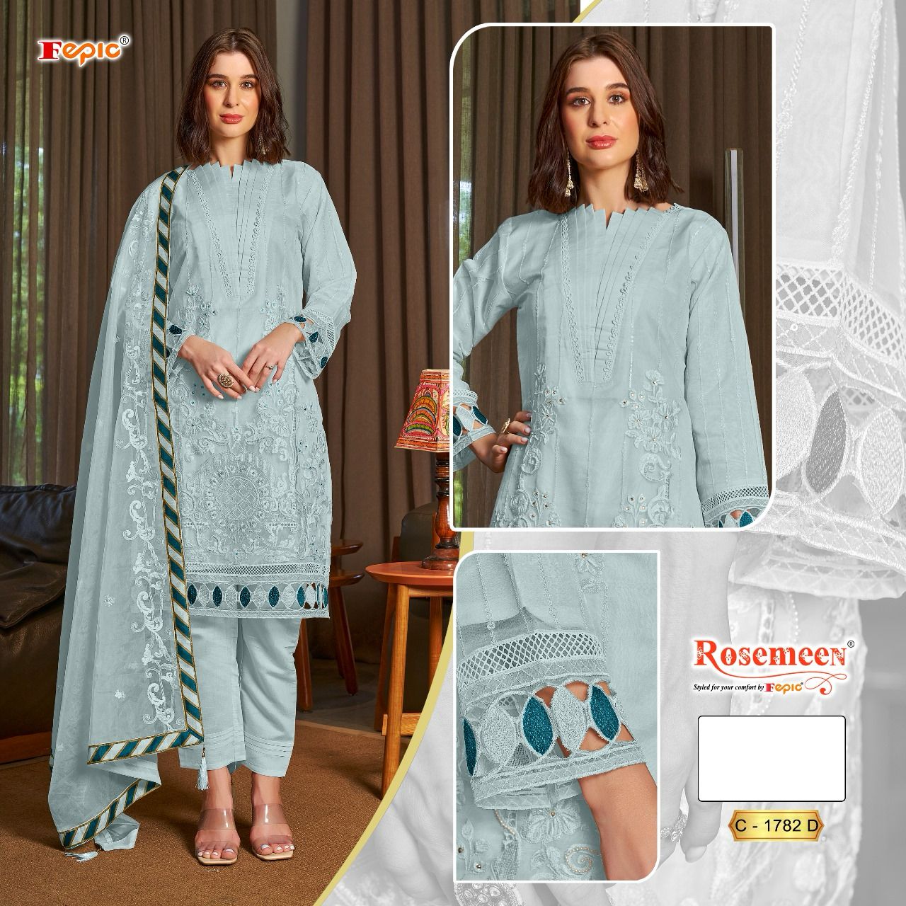 BRAND NAME:- FEPIC CATALOUGE NAME:- ROSEMEEN D NO:- C 1782 Top:- ORGANZA EMBROIDERED WITH HEAVY KHATLI WORK Dupatta:- ORGANZA EMBROIDERED WITH FOUR SIDED DIGITAL LACE Bottom:- SANTOON INNER:- SANTOON RATE:- 1475/- GST SHIP EXTRA 100+ SINGLE |