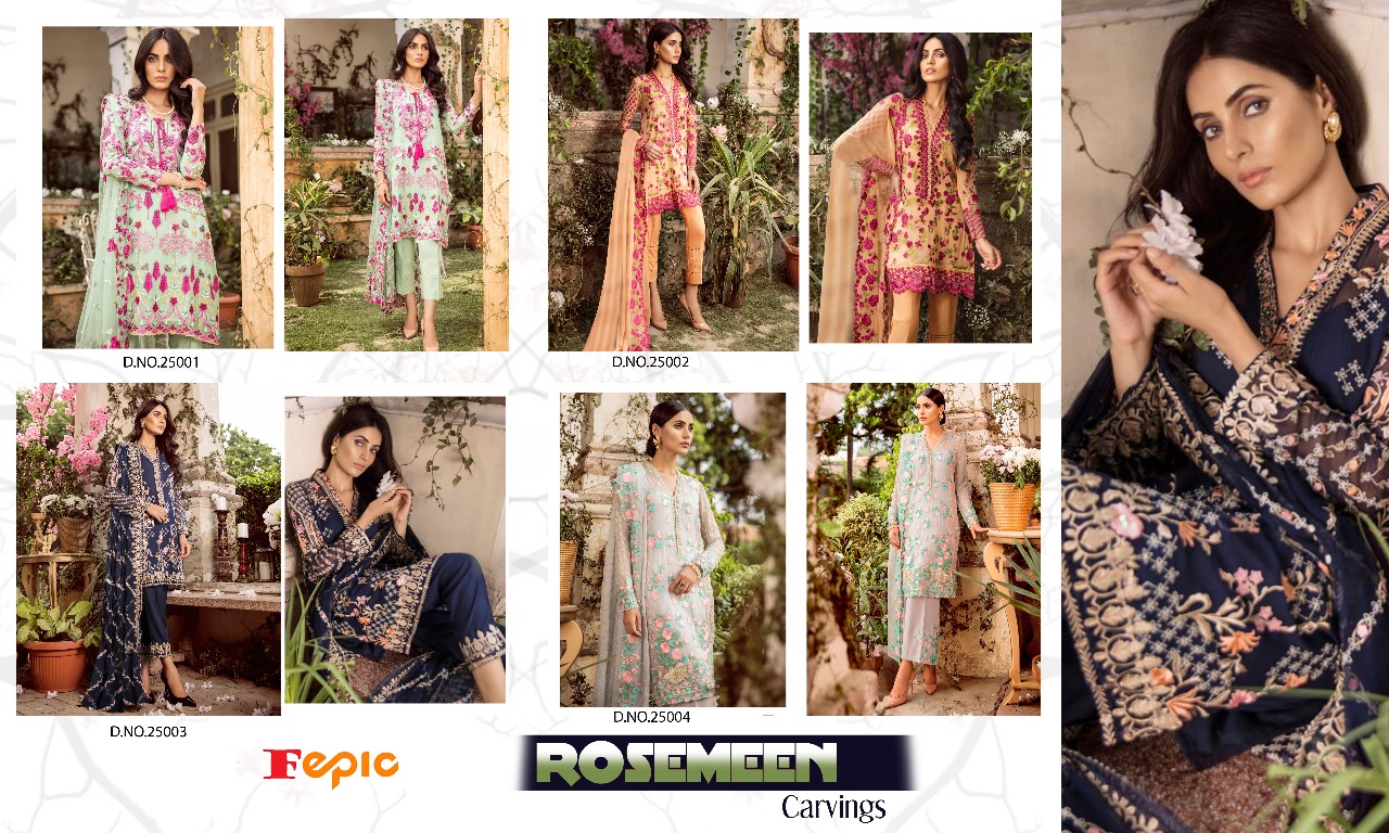 Buy Online Rosemeen Carvings By Fepic Georgette Designer Party Wear Pakistani Salwar Suits Wholesale Supplier And Dealer Gujarat 4 Pcs of Full Catalogue at Wholesale Price. Looking for Rosemeen Carvings By Fepic Georgette Designer Party Wear Pakistani Salwar Suits Wholesale Supplier And Dealer Gujarat Full Catalouge at Best Price? Buy Now Rosemeen Carvings By Fepic Georgette Designer Party Wear Pakistani Salwar Suits Wholesale Supplier And Dealer Gujarat at Wholesale Rate of Rs 4796 with Total 4 Pcs from authroized dealer and supplier of FEPIC Brand. Cost of Each piece is just only Rs 1199 which is very low and affordable price to resale the product in your retail store ,This is Surat based Wholesale Supplier & Dealer of FEPIC Brand. Click on Brand name to Know more about FEPIC Brand's products.Call or Whatsapp on 9898838984 for booking or enquiry