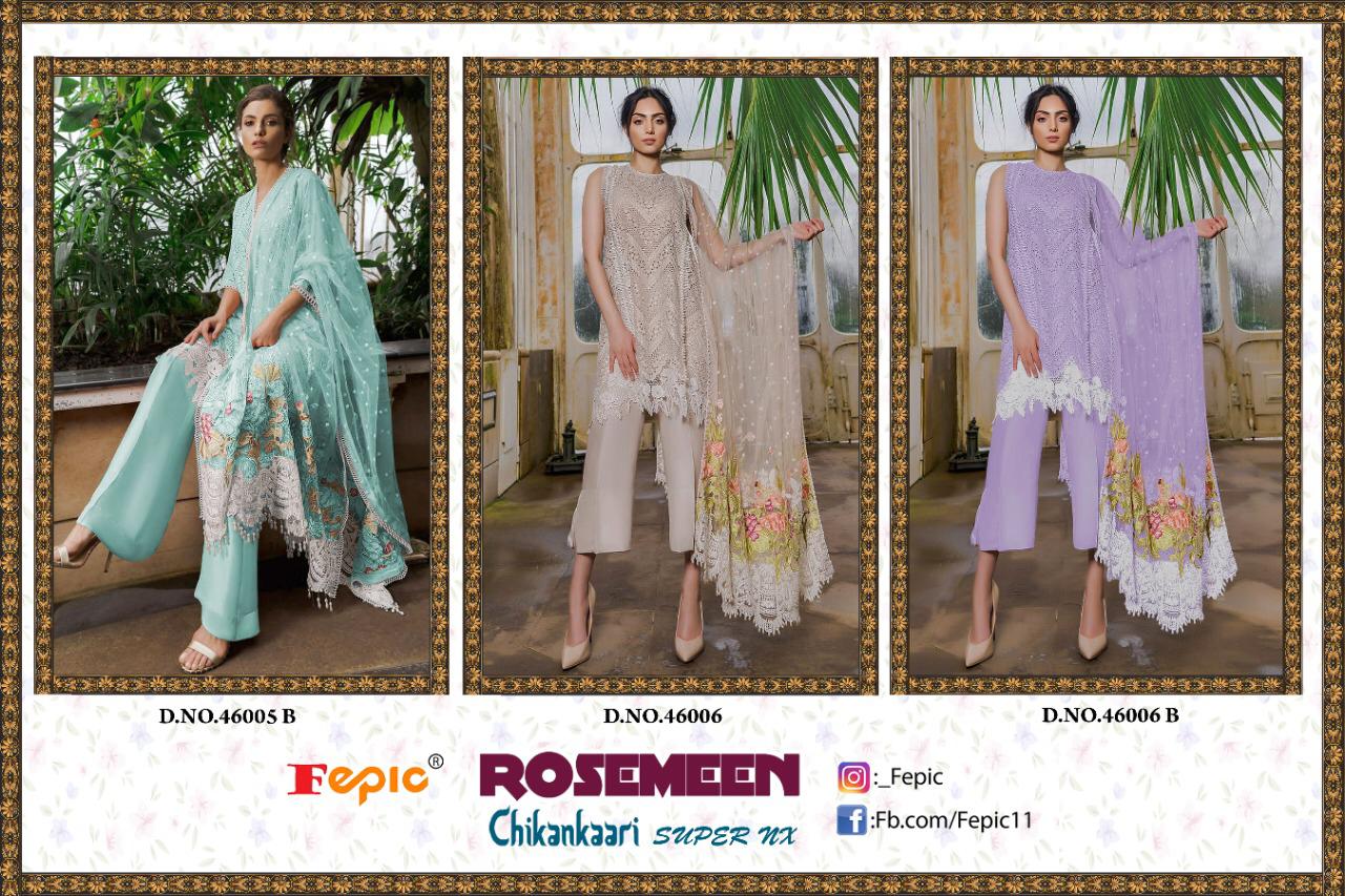 Buy Online Rosemeen Chikankaari Blockbuster Nx By Fepic Pakistani Suits Wholesale Supplier And Dealer Gujarat 3 Pcs of Full Catalogue at Wholesale Price. Looking for Rosemeen Chikankaari Blockbuster Nx By Fepic Pakistani Suits Wholesale Supplier And Dealer Gujarat Full Catalouge at Best Price? Buy Now Rosemeen Chikankaari Blockbuster Nx By Fepic Pakistani Suits Wholesale Supplier And Dealer Gujarat at Wholesale Rate of Rs 3297 with Total 3 Pcs from authroized dealer and supplier of FEPIC Brand. Cost of Each piece is just only Rs 1099 which is very low and affordable price to resale the product in your retail store ,This is Surat based Wholesale Supplier & Dealer of FEPIC Brand. Click on Brand name to Know more about FEPIC Brand's products.Call or Whatsapp on 9898838984 for booking or enquiry