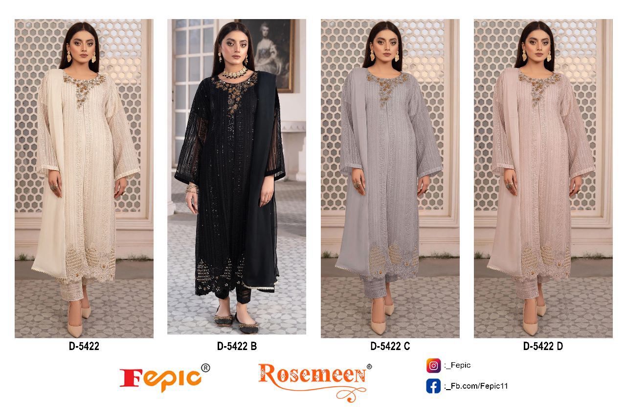 Buy Online Rosemeen D 5422 Fepic Georgette Embroidered Collection Manufacturer Surat 4 Pcs of Full Catalogue at Wholesale Price. Looking for Rosemeen D 5422 Fepic Georgette Embroidered Collection Manufacturer Surat Full Catalouge at Best Price? Buy Now Rosemeen D 5422 Fepic Georgette Embroidered Collection Manufacturer Surat at Wholesale Rate of Rs 4100 with Total 4 Pcs from authroized dealer and supplier of FEPIC Brand. Cost of Each piece is just only Rs 1025 which is very low and affordable price to resale the product in your retail store ,This is Surat based Wholesale Supplier & Dealer of FEPIC Brand. Click on Brand name to Know more about FEPIC Brand's products.Call or Whatsapp on 9898838984 for booking or enquiry