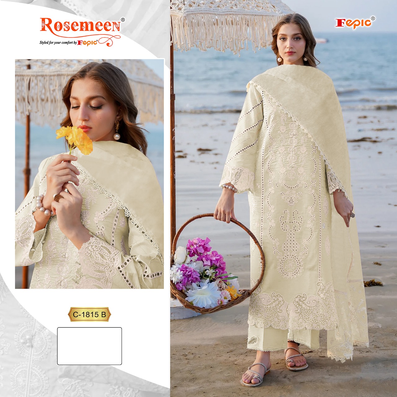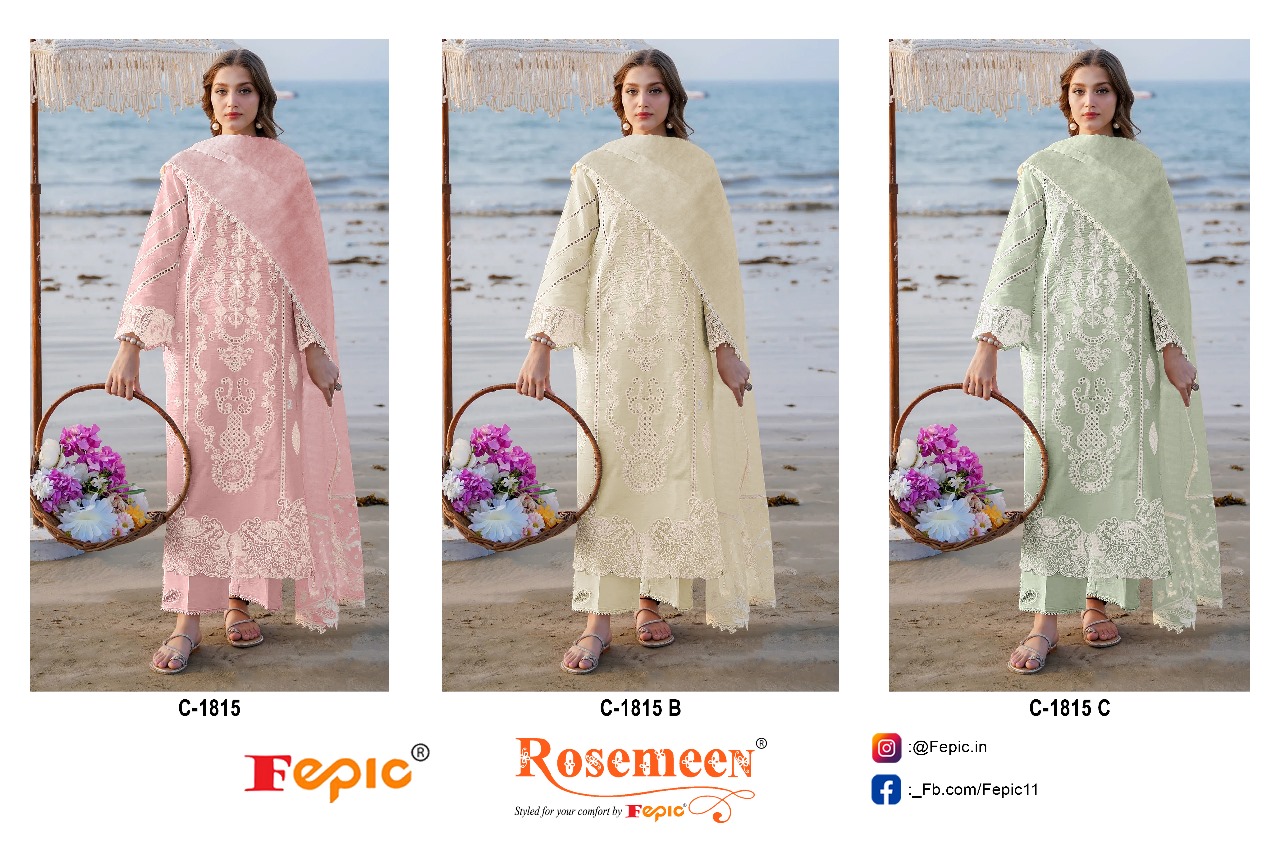 BRAND NAME:- FEPIC CATALOUGE NAME:- ROSEMEEN D NO:- 1815 Top:- PURE COTTON EMBROIDERED Dupatta:- EMBROIDERED NET Bottom:- SEMI LAWN DYED RATE:- 1199/- 100+ SINGLE |