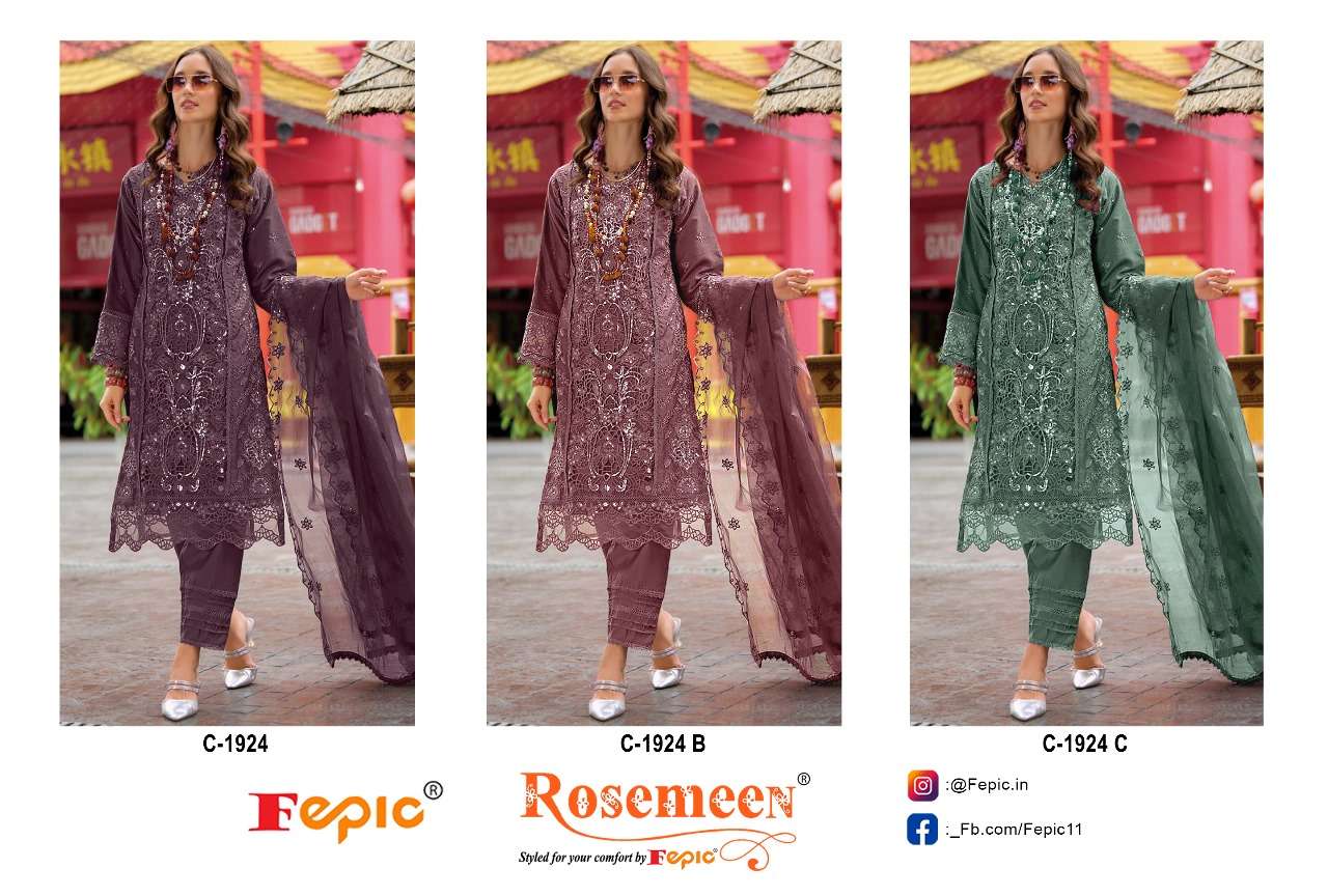 Buy Online ROSEMEEN D NO 1924 By FEPIC ORGANZA suit collection manufacturer surat 3 Pcs of Full Catalogue at Wholesale Price. Looking for ROSEMEEN D NO 1924 By FEPIC ORGANZA suit collection manufacturer surat Full Catalouge at Best Price? Buy Now ROSEMEEN D NO 1924 By FEPIC ORGANZA suit collection manufacturer surat at Wholesale Rate of Rs 4125 with Total 3 Pcs from authroized dealer and supplier of FEPIC Brand. Cost of Each piece is just only Rs 1375 which is very low and affordable price to resale the product in your retail store ,This is Surat based Wholesale Supplier & Dealer of FEPIC Brand. Click on Brand name to Know more about FEPIC Brand's products.Call or Whatsapp on 9898838984 for booking or enquiry