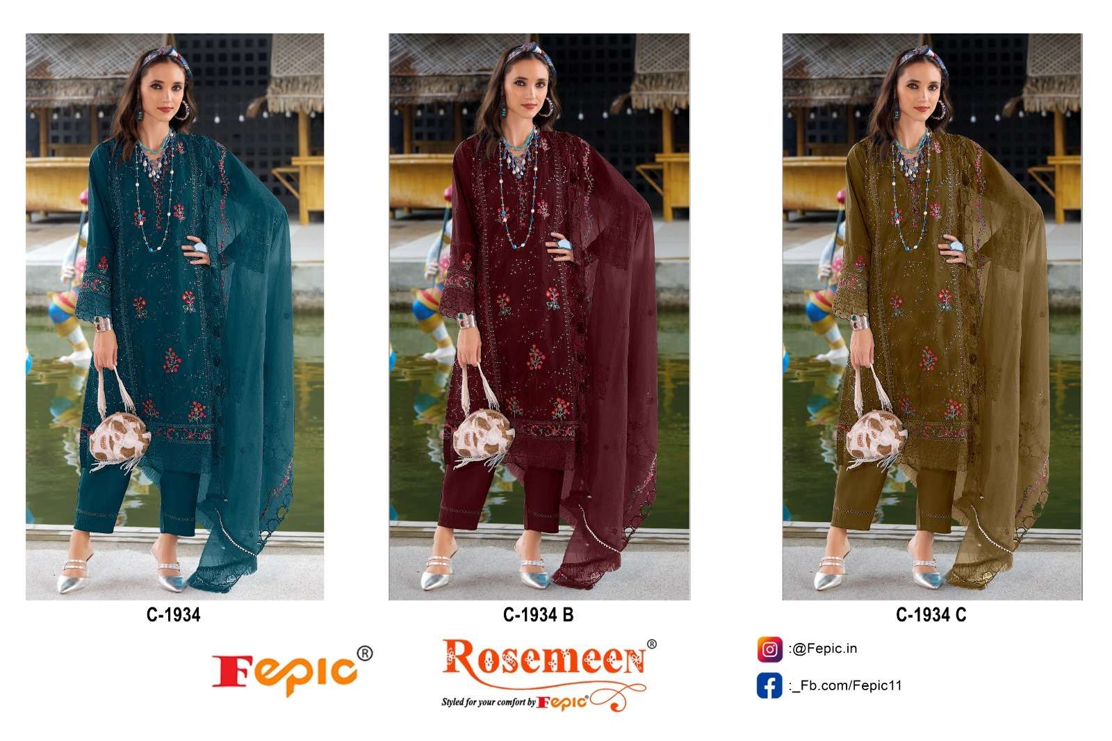 Buy Online ROSEMEEN D NO 1934 by FEPIC ORGANZA suit collection manufacturer surat 3 Pcs of Full Catalogue at Wholesale Price. Looking for ROSEMEEN D NO 1934 by FEPIC ORGANZA suit collection manufacturer surat Full Catalouge at Best Price? Buy Now ROSEMEEN D NO 1934 by FEPIC ORGANZA suit collection manufacturer surat at Wholesale Rate of Rs 4497 with Total 3 Pcs from authroized dealer and supplier of FEPIC Brand. Cost of Each piece is just only Rs 1499 which is very low and affordable price to resale the product in your retail store ,This is Surat based Wholesale Supplier & Dealer of FEPIC Brand. Click on Brand name to Know more about FEPIC Brand's products.Call or Whatsapp on 9898838984 for booking or enquiry
