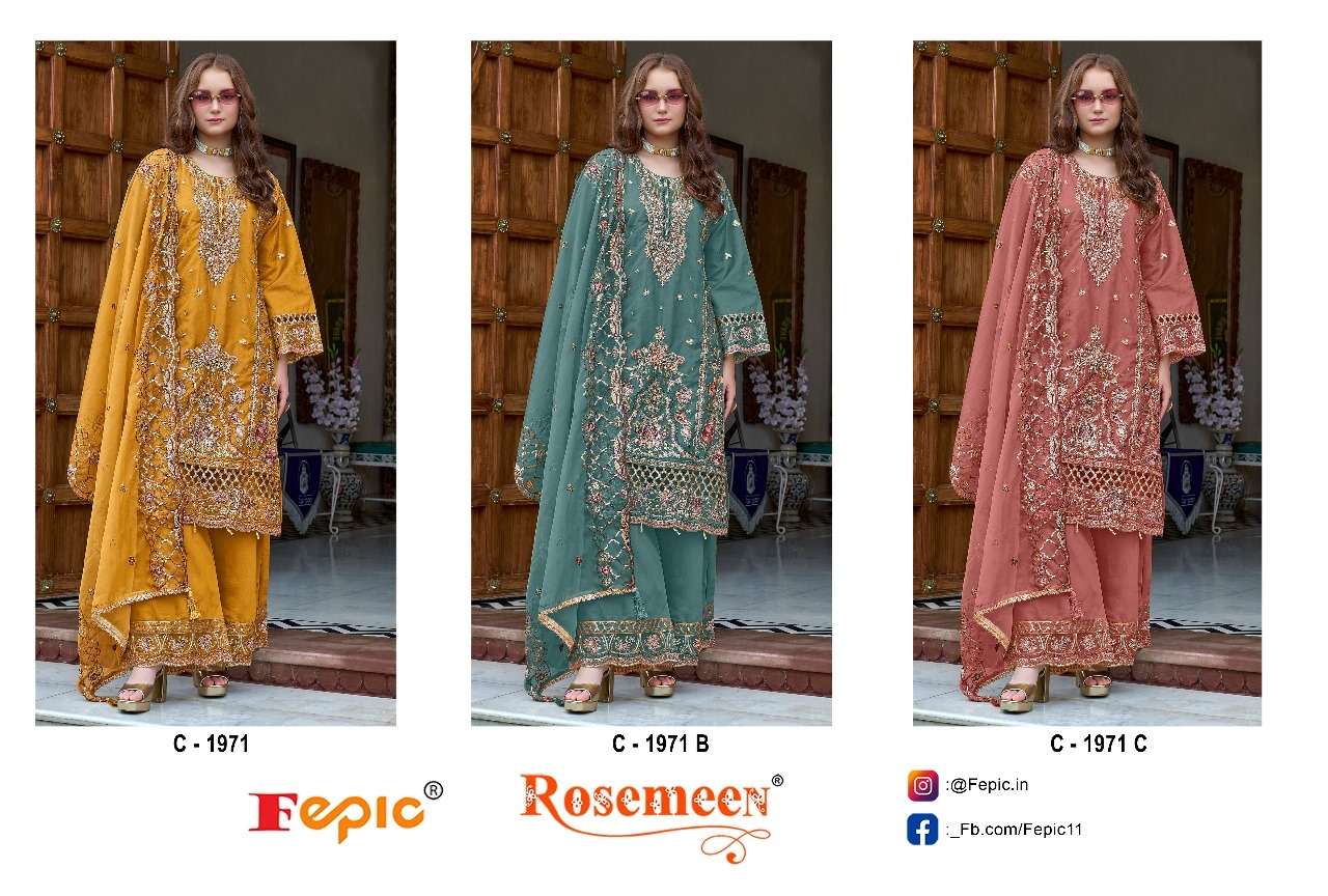 Buy Online ROSEMEEN D NO 1971 by FEPIC ORGANZA suit collection manufacturer surat 3 Pcs of Full Catalogue at Wholesale Price. Looking for ROSEMEEN D NO 1971 by FEPIC ORGANZA suit collection manufacturer surat Full Catalouge at Best Price? Buy Now ROSEMEEN D NO 1971 by FEPIC ORGANZA suit collection manufacturer surat at Wholesale Rate of Rs 3777 with Total 3 Pcs from authroized dealer and supplier of FEPIC Brand. Cost of Each piece is just only Rs 1259 which is very low and affordable price to resale the product in your retail store ,This is Surat based Wholesale Supplier & Dealer of FEPIC Brand. Click on Brand name to Know more about FEPIC Brand's products.Call or Whatsapp on 9898838984 for booking or enquiry