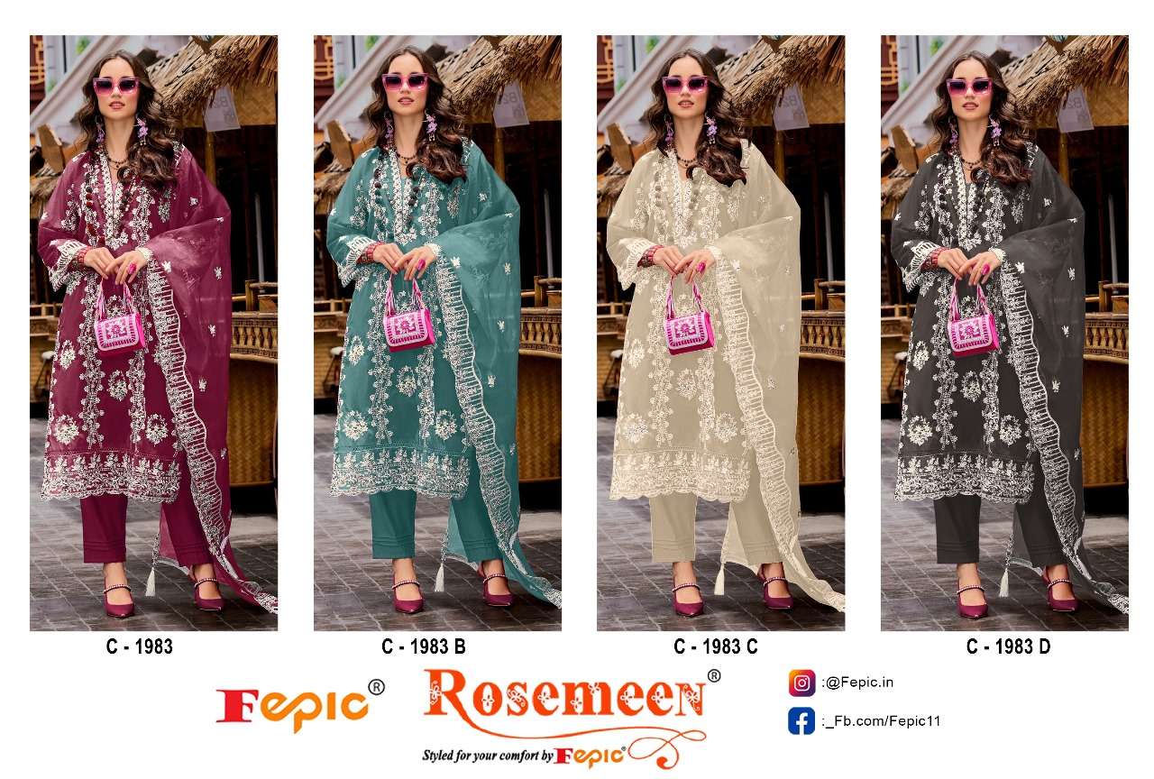 Buy Online ROSEMEEN D NO 1983 by FEPIC ORGANZA suit collection manufacturer surat 4 Pcs of Full Catalogue at Wholesale Price. Looking for ROSEMEEN D NO 1983 by FEPIC ORGANZA suit collection manufacturer surat Full Catalouge at Best Price? Buy Now ROSEMEEN D NO 1983 by FEPIC ORGANZA suit collection manufacturer surat at Wholesale Rate of Rs 5844 with Total 4 Pcs from authroized dealer and supplier of FEPIC Brand. Cost of Each piece is just only Rs 1461 which is very low and affordable price to resale the product in your retail store ,This is Surat based Wholesale Supplier & Dealer of FEPIC Brand. Click on Brand name to Know more about FEPIC Brand's products.Call or Whatsapp on 9898838984 for booking or enquiry