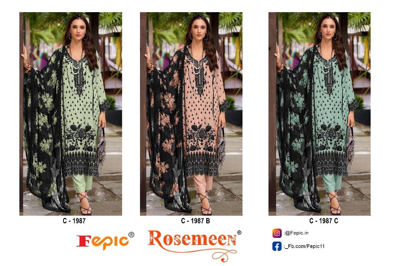 Buy Online ROSEMEEN D NO 1987 By FEPIC ORGANZA suit collection manufacturer surat 3 Pcs of Full Catalogue at Wholesale Price. Looking for ROSEMEEN D NO 1987 By FEPIC ORGANZA suit collection manufacturer surat Full Catalouge at Best Price? Buy Now ROSEMEEN D NO 1987 By FEPIC ORGANZA suit collection manufacturer surat at Wholesale Rate of Rs 3477 with Total 3 Pcs from authroized dealer and supplier of FEPIC Brand. Cost of Each piece is just only Rs 1159 which is very low and affordable price to resale the product in your retail store ,This is Surat based Wholesale Supplier & Dealer of FEPIC Brand. Click on Brand name to Know more about FEPIC Brand's products.Call or Whatsapp on 9898838984 for booking or enquiry
