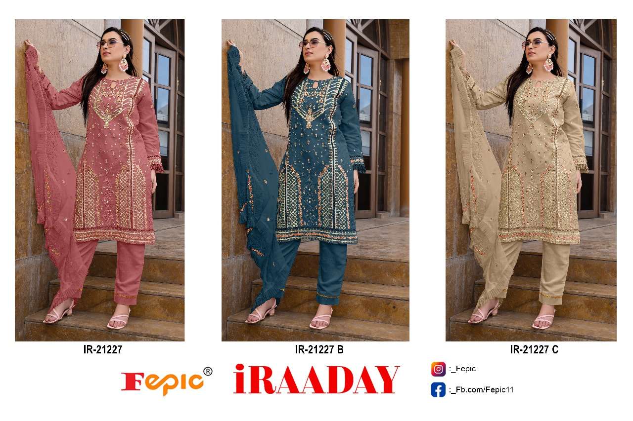 Buy Online ROSEMEEN D NO 21227 by FEPIC ORGANZA suit collection manufacturer surat 3 Pcs of Full Catalogue at Wholesale Price. Looking for ROSEMEEN D NO 21227 by FEPIC ORGANZA suit collection manufacturer surat Full Catalouge at Best Price? Buy Now ROSEMEEN D NO 21227 by FEPIC ORGANZA suit collection manufacturer surat at Wholesale Rate of Rs 3225 with Total 3 Pcs from authroized dealer and supplier of FEPIC Brand. Cost of Each piece is just only Rs 1075 which is very low and affordable price to resale the product in your retail store ,This is Surat based Wholesale Supplier & Dealer of FEPIC Brand. Click on Brand name to Know more about FEPIC Brand's products.Call or Whatsapp on 9898838984 for booking or enquiry