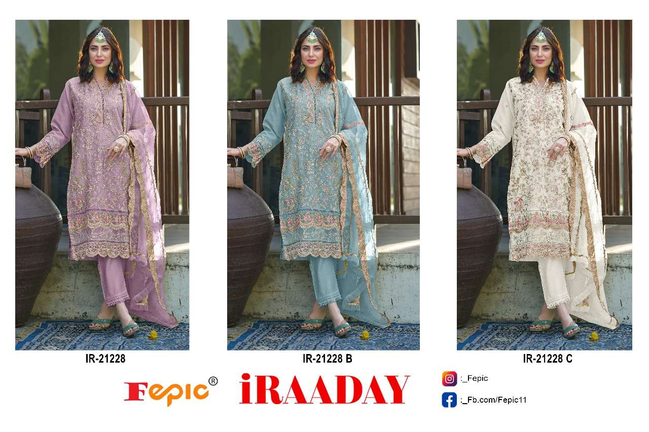Buy Online ROSEMEEN D NO 21228 by FEPIC fancy suit collection manufacturer surat 3 Pcs of Full Catalogue at Wholesale Price. Looking for ROSEMEEN D NO 21228 by FEPIC fancy suit collection manufacturer surat Full Catalouge at Best Price? Buy Now ROSEMEEN D NO 21228 by FEPIC fancy suit collection manufacturer surat at Wholesale Rate of Rs 3663 with Total 3 Pcs from authroized dealer and supplier of FEPIC Brand. Cost of Each piece is just only Rs 1221 which is very low and affordable price to resale the product in your retail store ,This is Surat based Wholesale Supplier & Dealer of FEPIC Brand. Click on Brand name to Know more about FEPIC Brand's products.Call or Whatsapp on 9898838984 for booking or enquiry