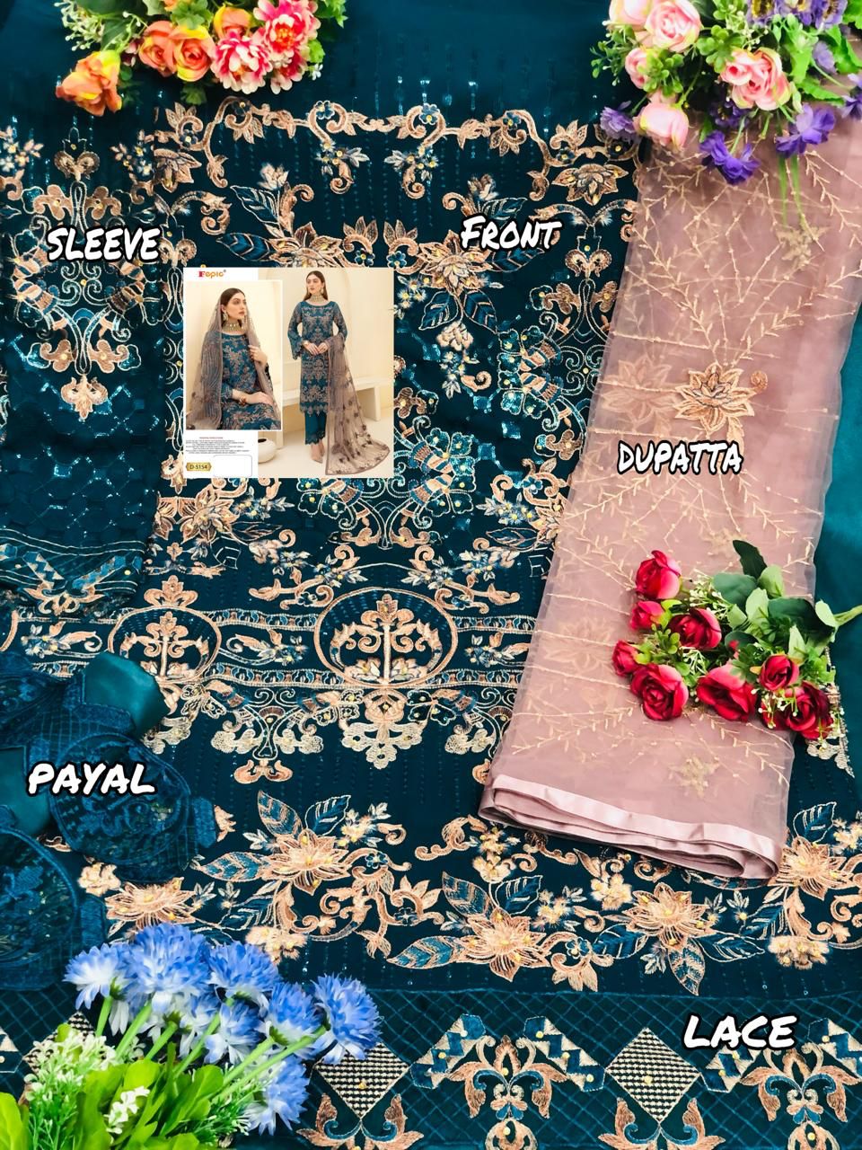 *BRAND NAME:-* FEPIC *CATALOUGE NAME:-* ROSEMEEN *D NO:-* D-5154 ( 4 PC SET ) *Top:-* HEAVY GEORGETTE EMBROIDERED WITH HAND WORK *Dupatta:-* BUTTERFLY NET EMBROIEDED *Bottom:-* SANTOON with Embroidery patch *INNER:-* SANTOON *RATE:-* 1299/- |