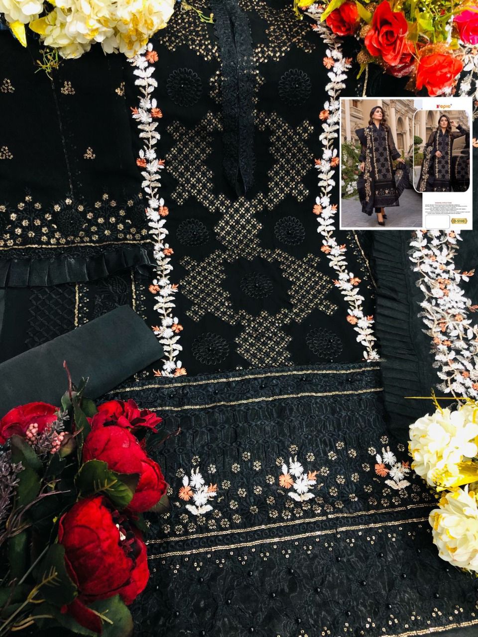 _*BRAND NAME*_:- FEPIC _*CATALOUGE NAME*_:- ROSEMEEN _*D NO*_:- D 5193 ( 4 pc set ) _*Top*_:- GEORGETTE EMBROIDERED _*Dupatta*_:- NET EMBROIDERED WITH FOUR SIDED FRILL LACE _*Bottom*_:-SANTOON _*INNER*_:- SANTOON _*RATE*_:-1151/- |