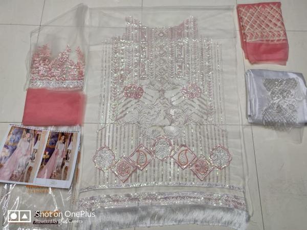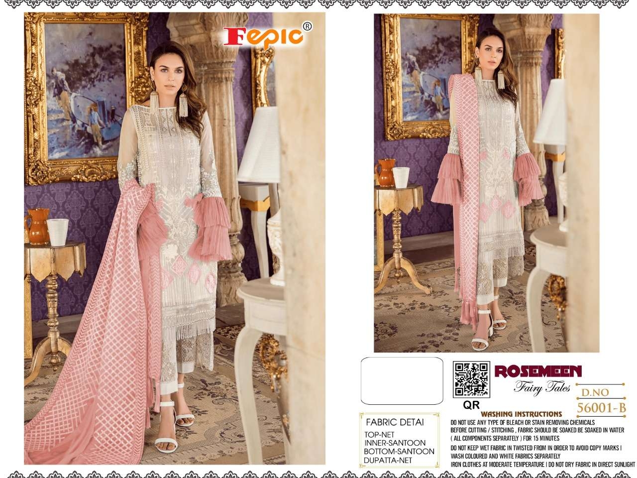 *BRAND NAME:-* FEPIC *CATALOUGE NAME:-* ROSEMEEN *D NO:-* 56001 *Top:-* NET EMBROIDERED WITH HAND WORK *Dupatta:-* NET HEAVY EMBROIDERED *Bottom:-* DULL SANTOON *INNER:-* DULL SANTOON *RATE: 1359/-* Gst ship extra 100+single |
