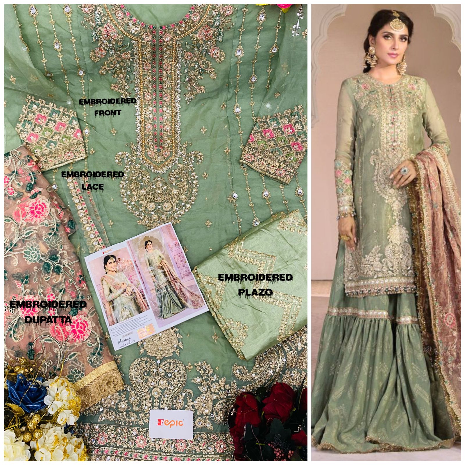 _* BRAND NAME:- *_ FEPIC _* CATALOUGE NAME:- *_ ROSEMEEN _* D NO:- *_ 60011 _* Top:- *_ PURE ORGANZA EMBROIDERED WITH HEAVY HANDWORKED _* Dupatta:- *_ NET HEAVY EMBROIDERED _* Bottom:- *_ SANTOON EMBROIDERED _* INNER:- *_ SANTOON _* RATE:- *_ 1659/- |