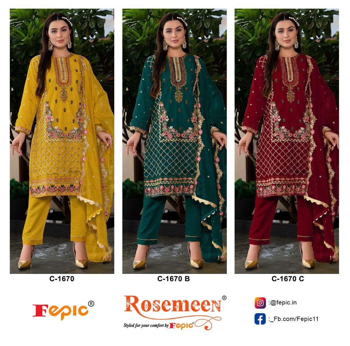 Buy Online ROSEMEEN D NO C 1670 by FEPIC GEORGETTE suit collection manufacturer surat 3 Pcs of Full Catalogue at Wholesale Price. Looking for ROSEMEEN D NO C 1670 by FEPIC GEORGETTE suit collection manufacturer surat Full Catalouge at Best Price? Buy Now ROSEMEEN D NO C 1670 by FEPIC GEORGETTE suit collection manufacturer surat at Wholesale Rate of Rs 4047 with Total 3 Pcs from authroized dealer and supplier of FEPIC Brand. Cost of Each piece is just only Rs 1349 which is very low and affordable price to resale the product in your retail store ,This is Surat based Wholesale Supplier & Dealer of FEPIC Brand. Click on Brand name to Know more about FEPIC Brand's products.Call or Whatsapp on 9898838984 for booking or enquiry