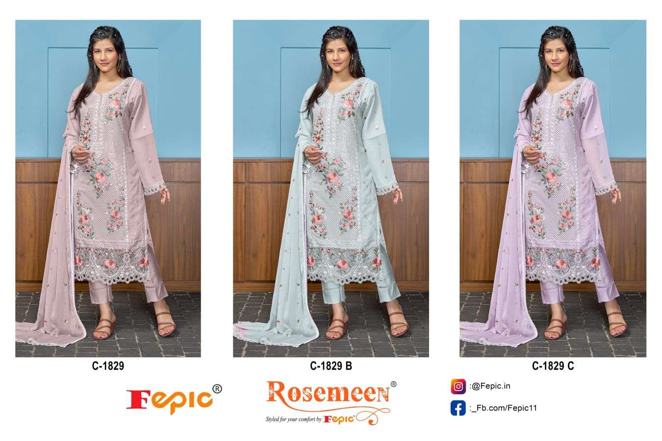 Buy Online ROSEMEEN D NO C 1829 by FEPIC GEORGETTE suit collection manufacturer surat 3 Pcs of Full Catalogue at Wholesale Price. Looking for ROSEMEEN D NO C 1829 by FEPIC GEORGETTE suit collection manufacturer surat Full Catalouge at Best Price? Buy Now ROSEMEEN D NO C 1829 by FEPIC GEORGETTE suit collection manufacturer surat at Wholesale Rate of Rs 3447 with Total 3 Pcs from authroized dealer and supplier of FEPIC Brand. Cost of Each piece is just only Rs 1149 which is very low and affordable price to resale the product in your retail store ,This is Surat based Wholesale Supplier & Dealer of FEPIC Brand. Click on Brand name to Know more about FEPIC Brand's products.Call or Whatsapp on 9898838984 for booking or enquiry
