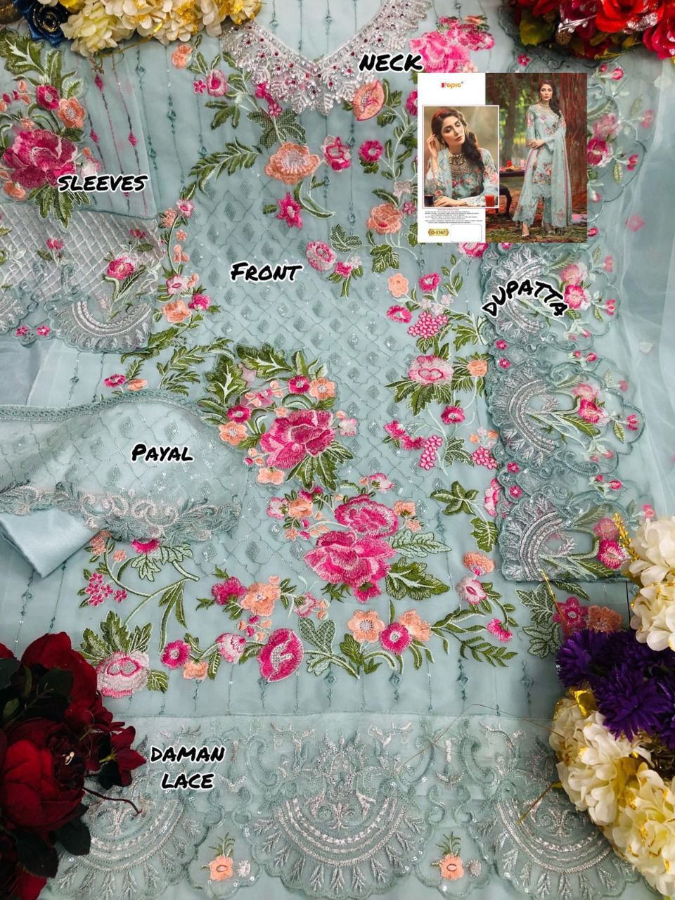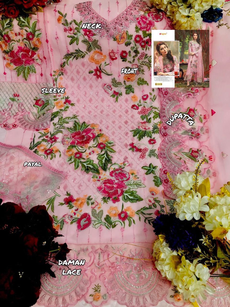 *BRAND NAME:-* FEPIC *CATALOUGE NAME:-* ROSEMEEN *D NO:-* D-5167 ( 3 PC SET ) *Top:-* FAUX GEORGETTE EMBOIRDERED WITH HANDWORK *Dupatta:-* HEAVY NET EMBROIDERY *Bottom:-* SANTOON *Bottom:-* SANTOON *RATE:-* 1321/- *SINGLE MULTIPLES AVAILABLE* 100+single |